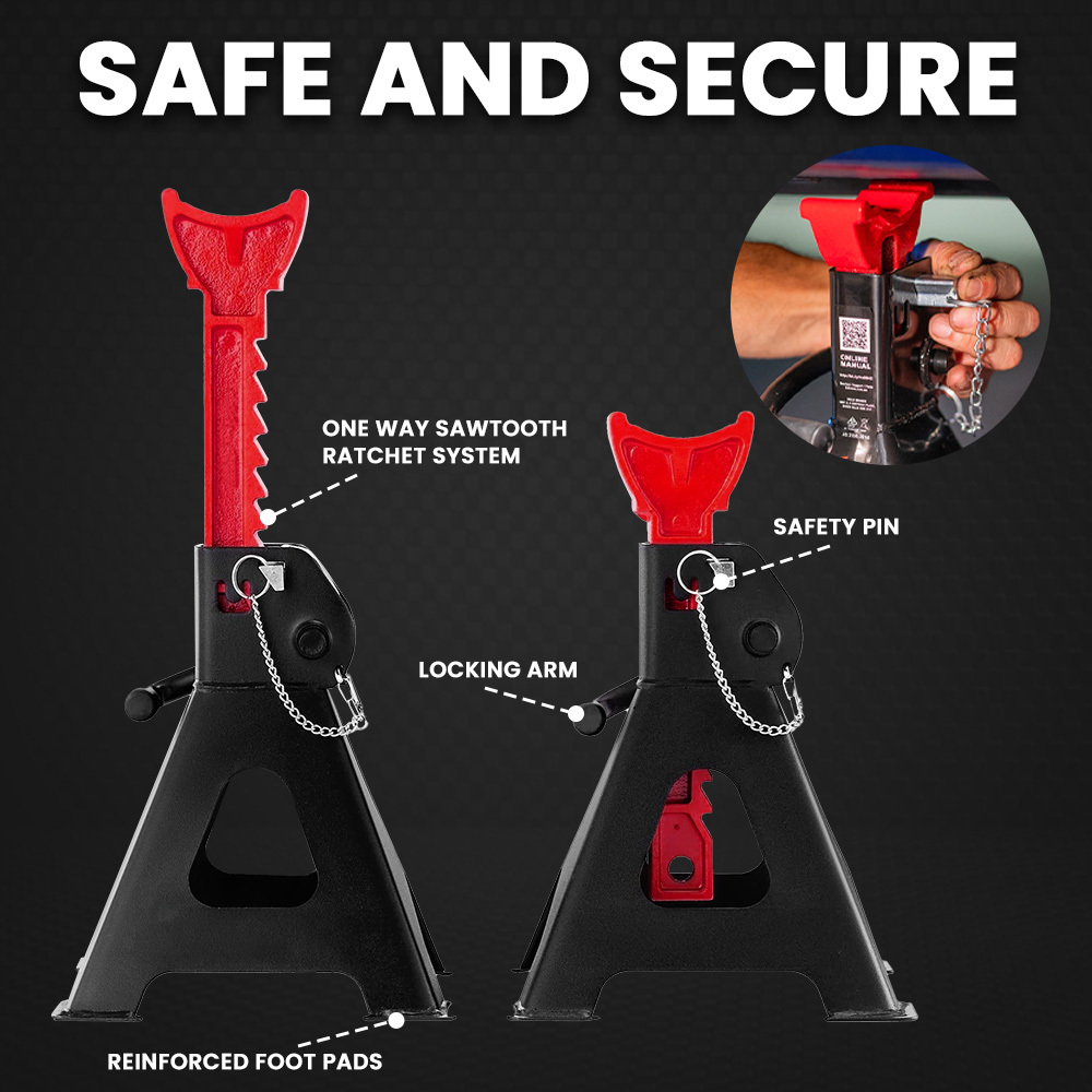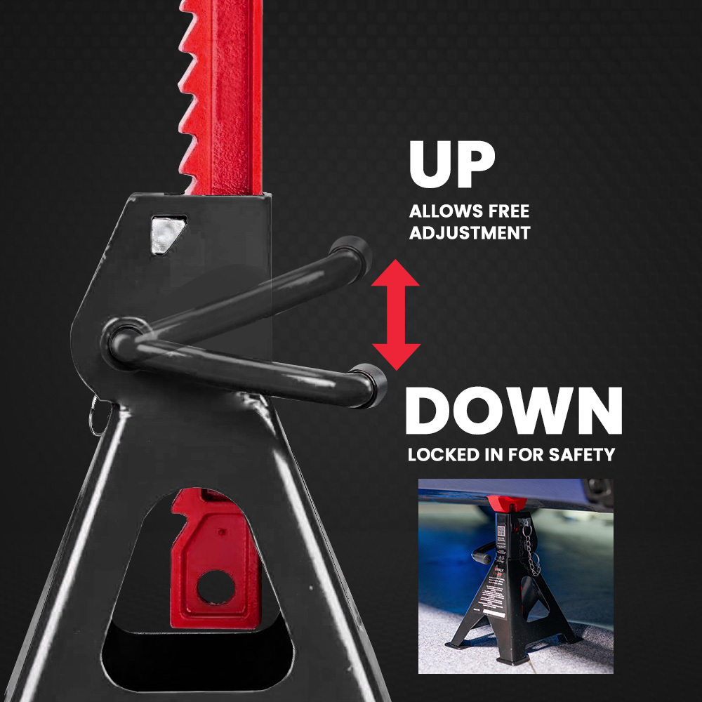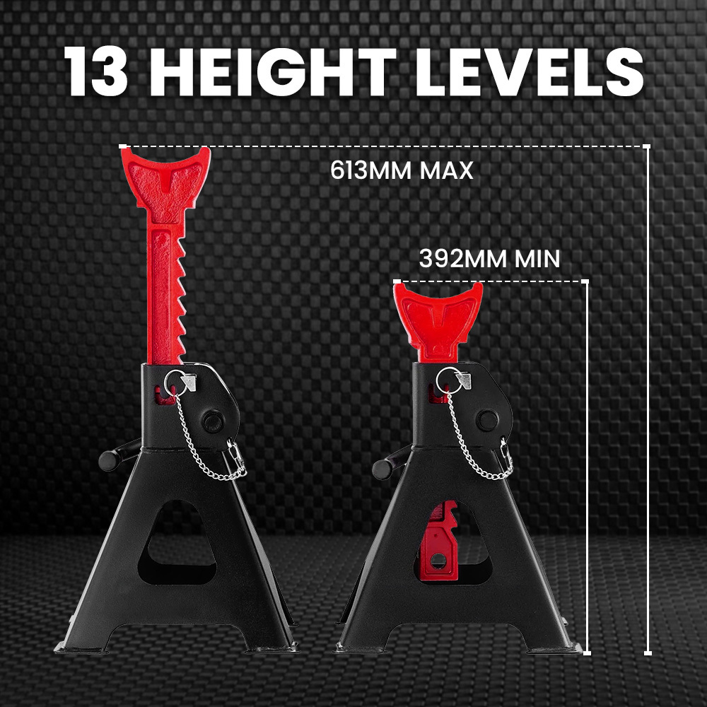 These automotive car jack stands are designed to provide secure and adjustable support for vehicle maintenance tasks. They feature a high load capacity and multiple height adjustments to accommodate various under-vehicle work requirements.