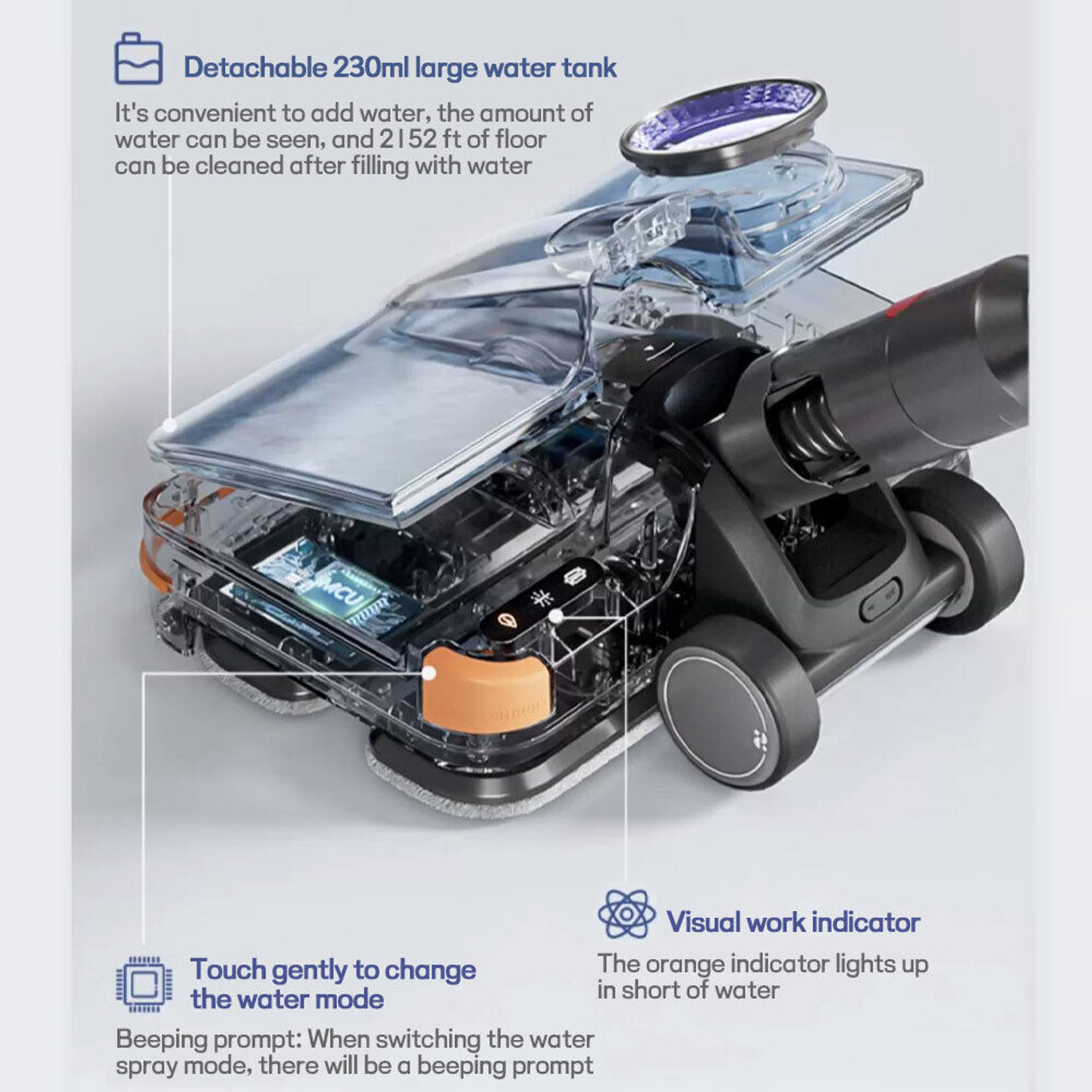 - Intelligent three-level water volume control for customized cleaning based on the floor type