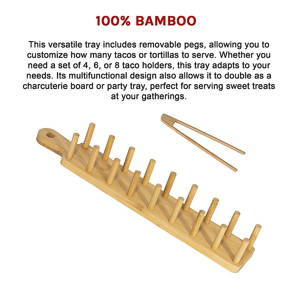 - Includes: Taco tray, 18 removable pegs, bamboo tongs