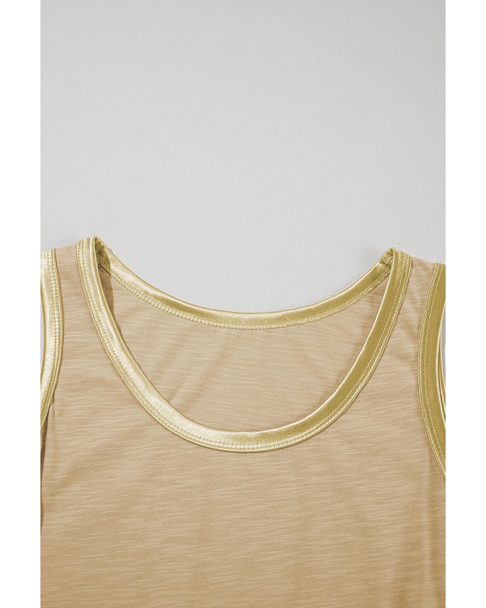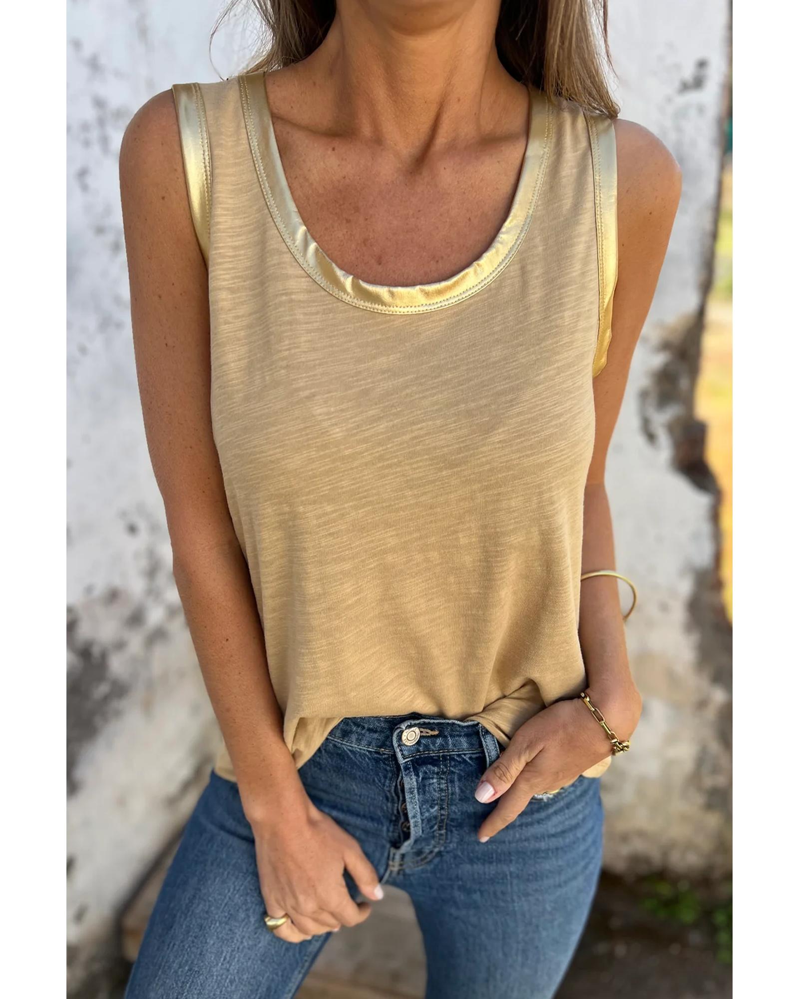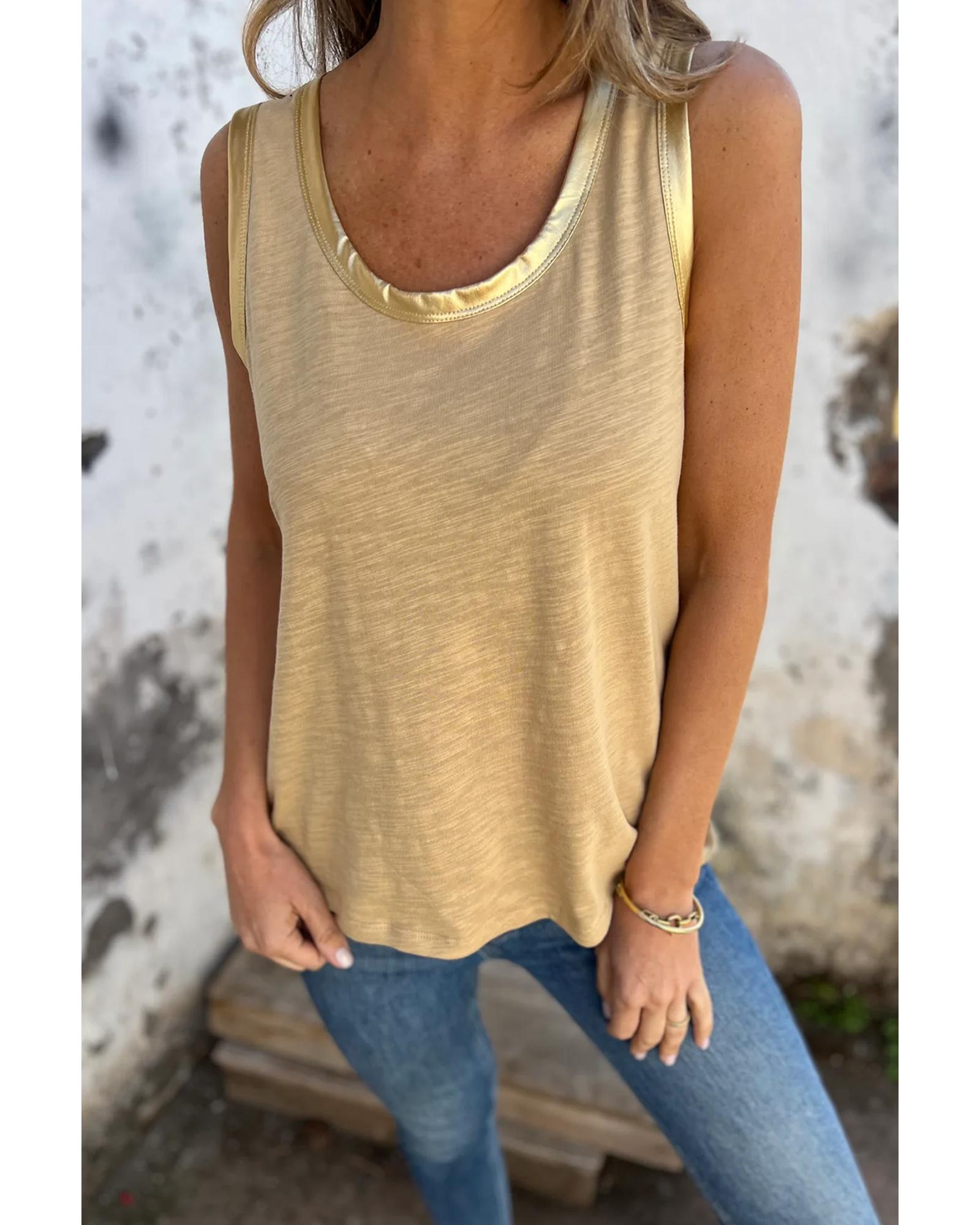 This tank top features a striking metallic sheen along the edge, adding a touch of glamour to your outfit. Its flattering scoop neckline enhances the neckline, making it suitable for various styles. Crafted from a soft and breathable cotton blend fabric, it offers all-day comfort and versatility, whether layered or worn alone.