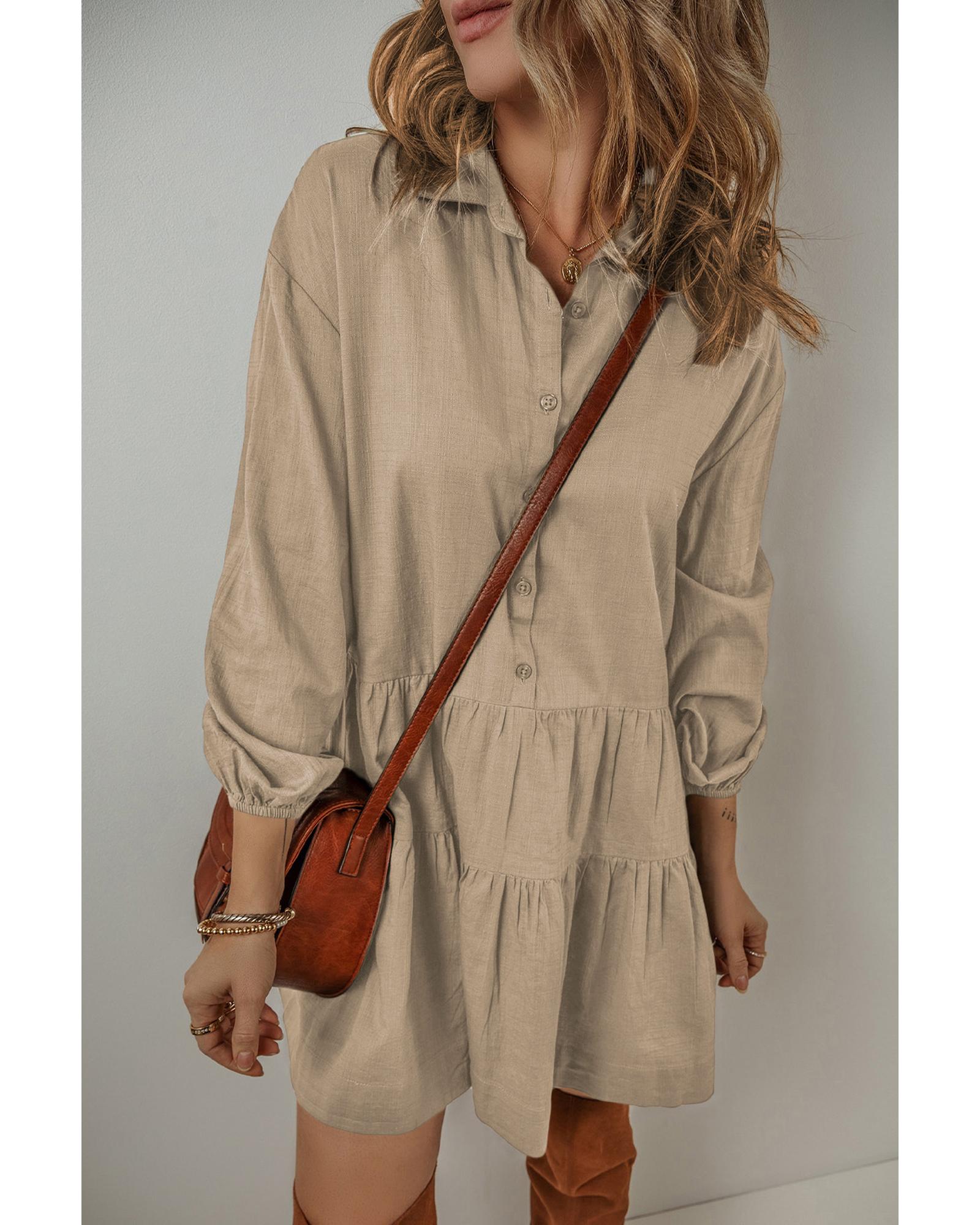 Tan Puff Sleeve Buttoned Tiered Pleated Shirt Mini Dress – M