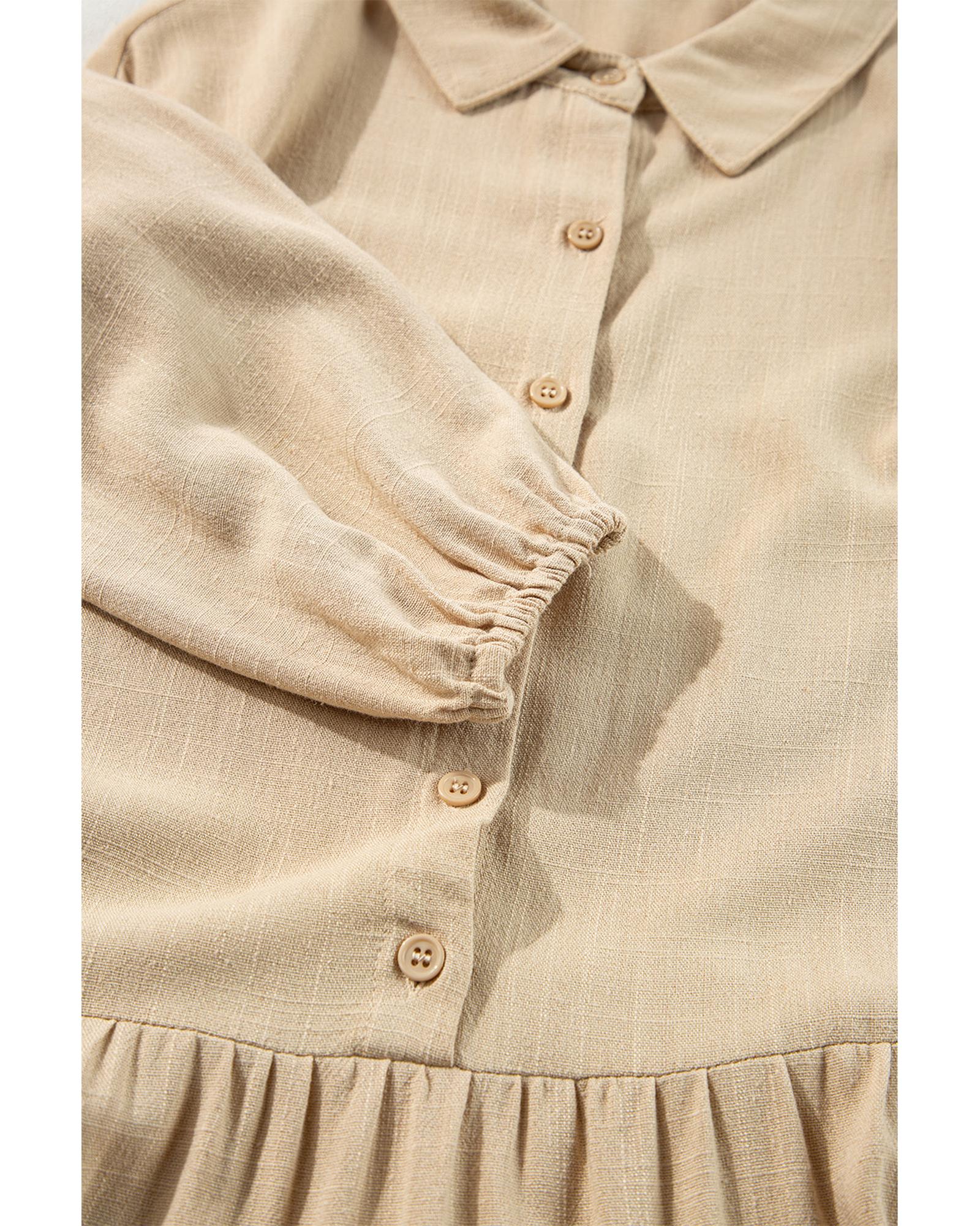 Tan Puff Sleeve Buttoned Tiered Pleated Shirt Mini Dress – S