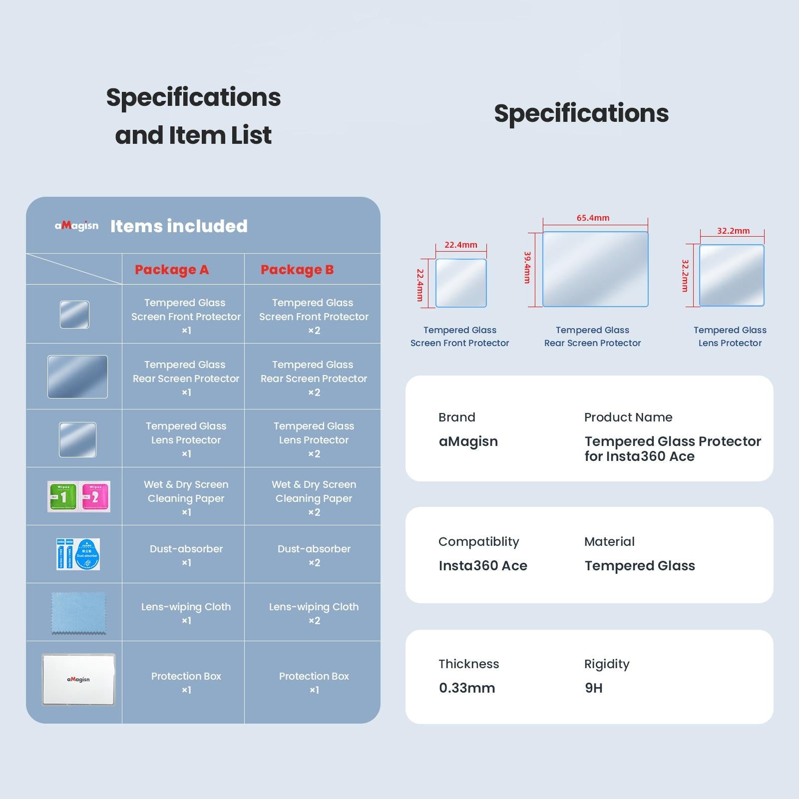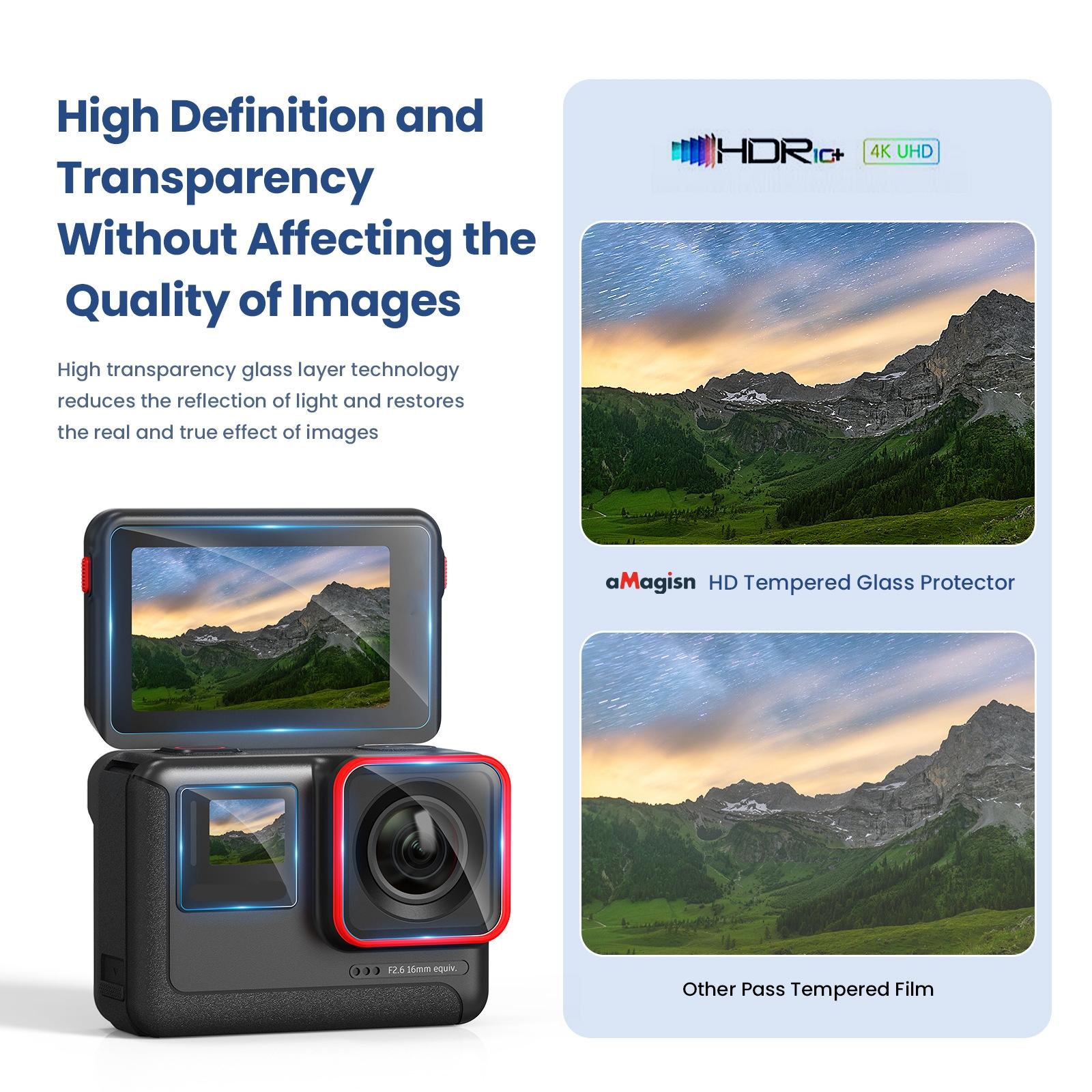 These tempered film protective stickers are designed to provide comprehensive protection for your Insta360 Ace Amagisn sports camera. They cover the full screen and lens with original molding, ensuring all-round protection without dead angles. Made from high-hardness tempered glass, they offer durable, explosion-proof, and scratch-resistant features, while maintaining high transparency for clear, high-definition photos. The smooth surface provides a sensitive touch experience without obstruction.
