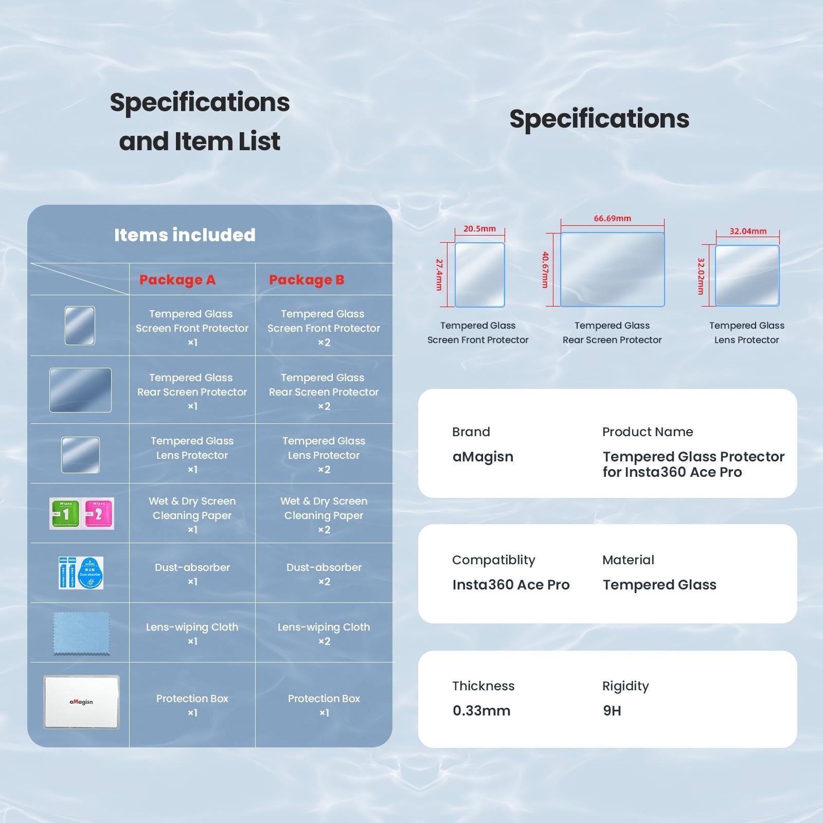 This tempered protective film set offers comprehensive coverage for the entire screen and lens of your sports camera, providing all-round protection with no dead angles. Crafted from high-hardness tempered glass, it features multiple layers of reinforcement to ensure durability, explosion resistance, and effective protection against scratches, dirt, and water. The high transmittance glass technology reduces light reflection, delivering clear, high-definition images with minimal glare. The films have a smooth touch feel and are designed to be sensitive to touch without obstructing functionality.