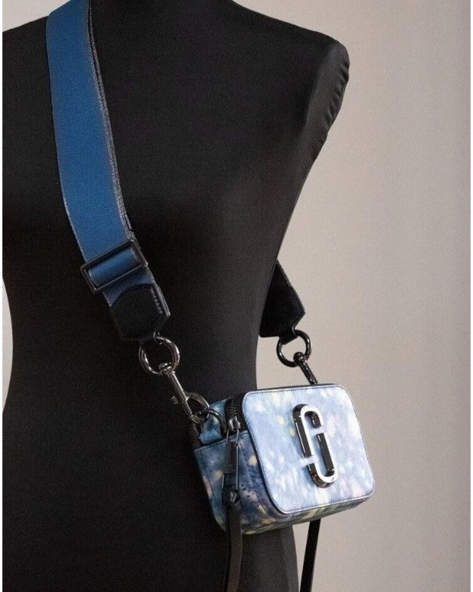 This watercolor snapshot shoulder bag is a stylish accessory designed for women. It features a vibrant blue multi-color print and is made from printed saffiano leather, offering both durability and a fashionable appearance. The bag provides ample storage with two main zip compartments, an inner slip pocket, and an outer slip pocket. It also includes a detachable webbing shoulder strap for versatile carrying options and a secure zip closure to keep belongings safe.
