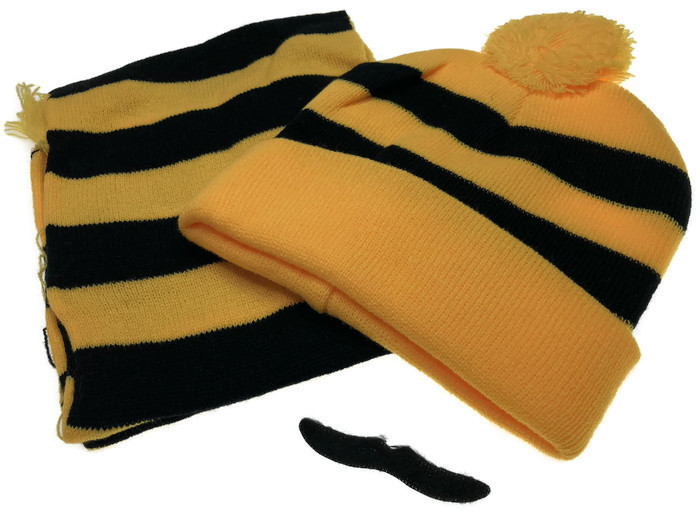 This set includes a beanie hat and a matching scarf designed for warmth and style during winter. Perfect for parties, costume events, or sporting occasions, it features a bold black and yellow stripe pattern. The set also includes a fun moustache accessory to enhance your costume or outfit.
