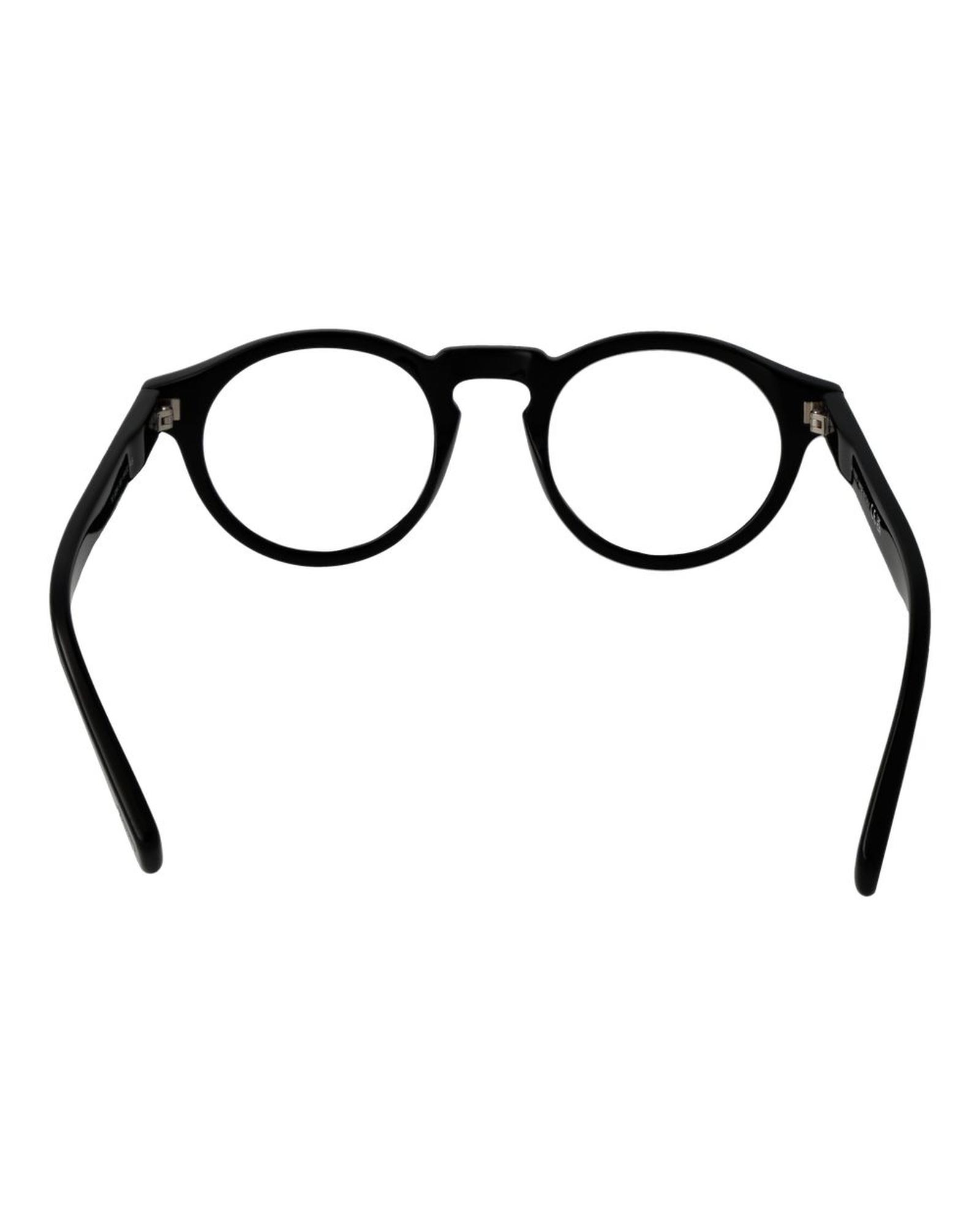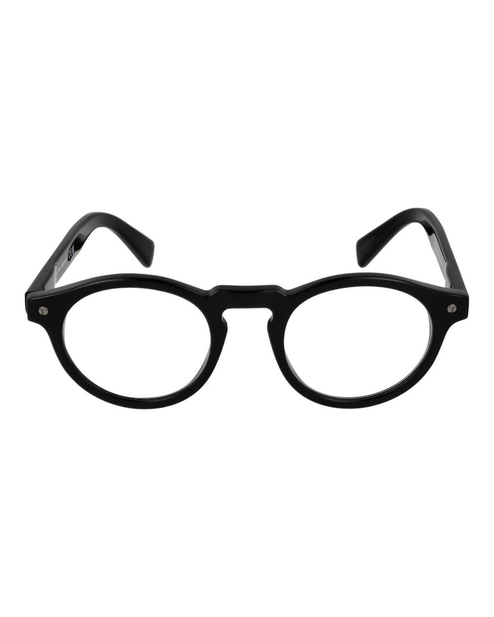 This pair of optical frames is designed for men, featuring a classic round style with a full rim. Made from durable acetate, these frames offer a sleek black appearance suitable for various occasions. The included demo lenses are made of plastic, providing a lightweight and comfortable fit.