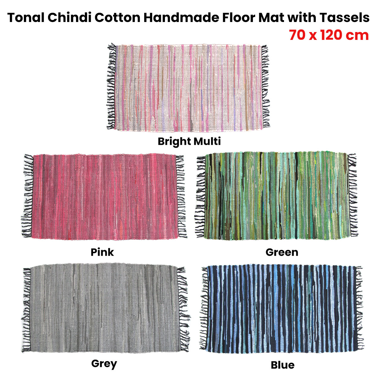 Tonal Chindi Cotton Handmade Floor Mat with Tassels 70 x 120 cm Bright Multi