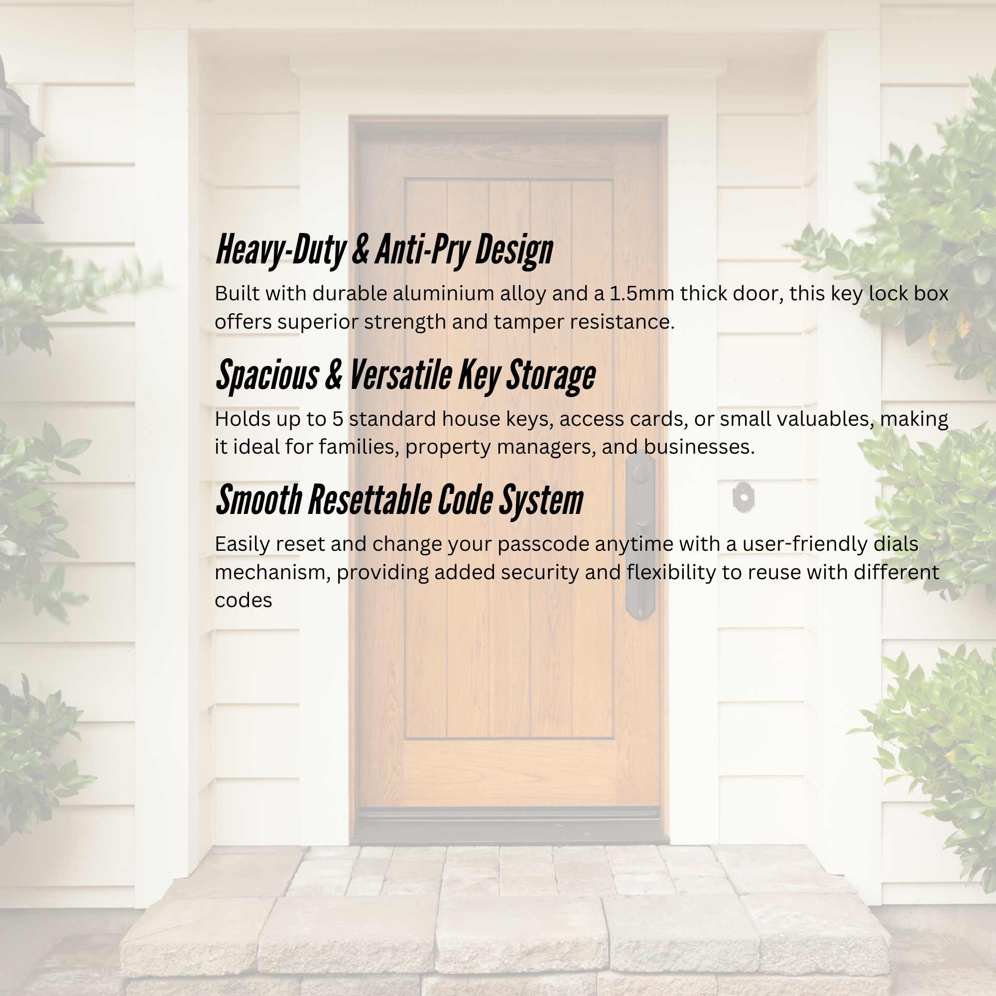 The wall-mounted key lock box provides a secure and convenient solution for storing keys and small valuables. It features a 4-digit combination lock with a large number of possible codes, ensuring high security. Made from durable materials and designed to withstand outdoor conditions, it is suitable for various settings including homes, offices, and rental properties. Its compact design allows for easy installation and use, offering reliable access control.