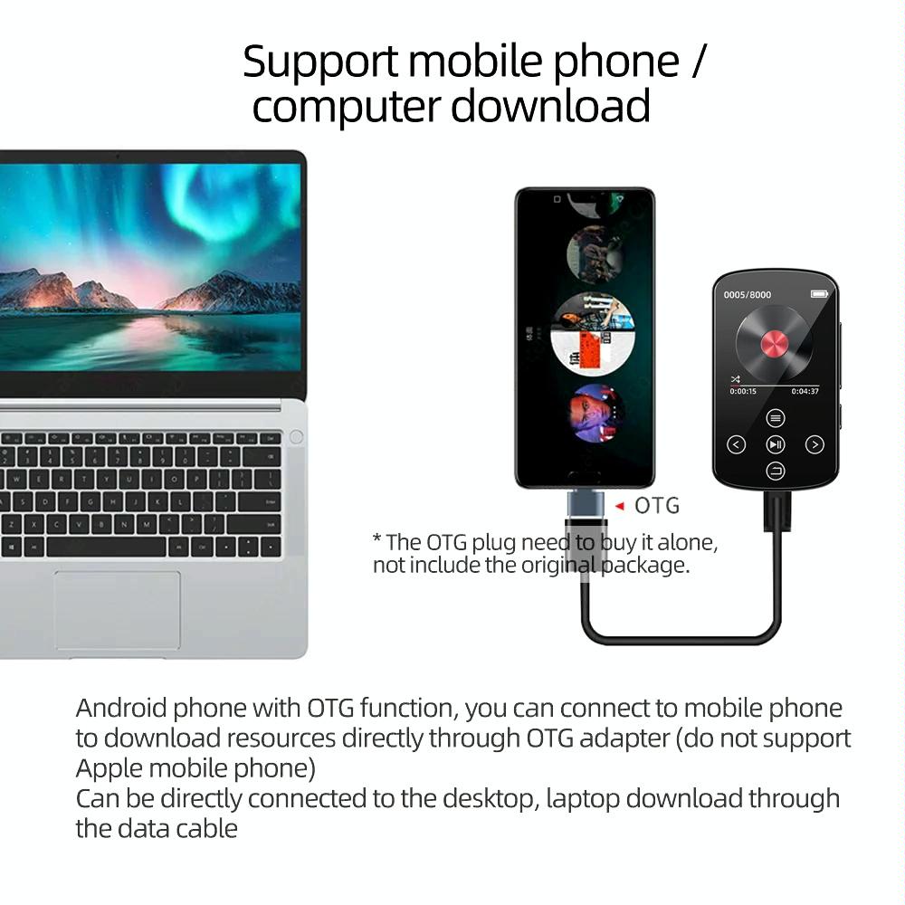 This compact and lightweight touch screen MP3 Bluetooth music player offers a versatile and immersive music experience. It features a high-brightness 1.54-inch touch screen, supports various audio formats, and includes a back clip for easy portability. The device supports Bluetooth 5.4 for stable connectivity, making it suitable for sports and everyday use.