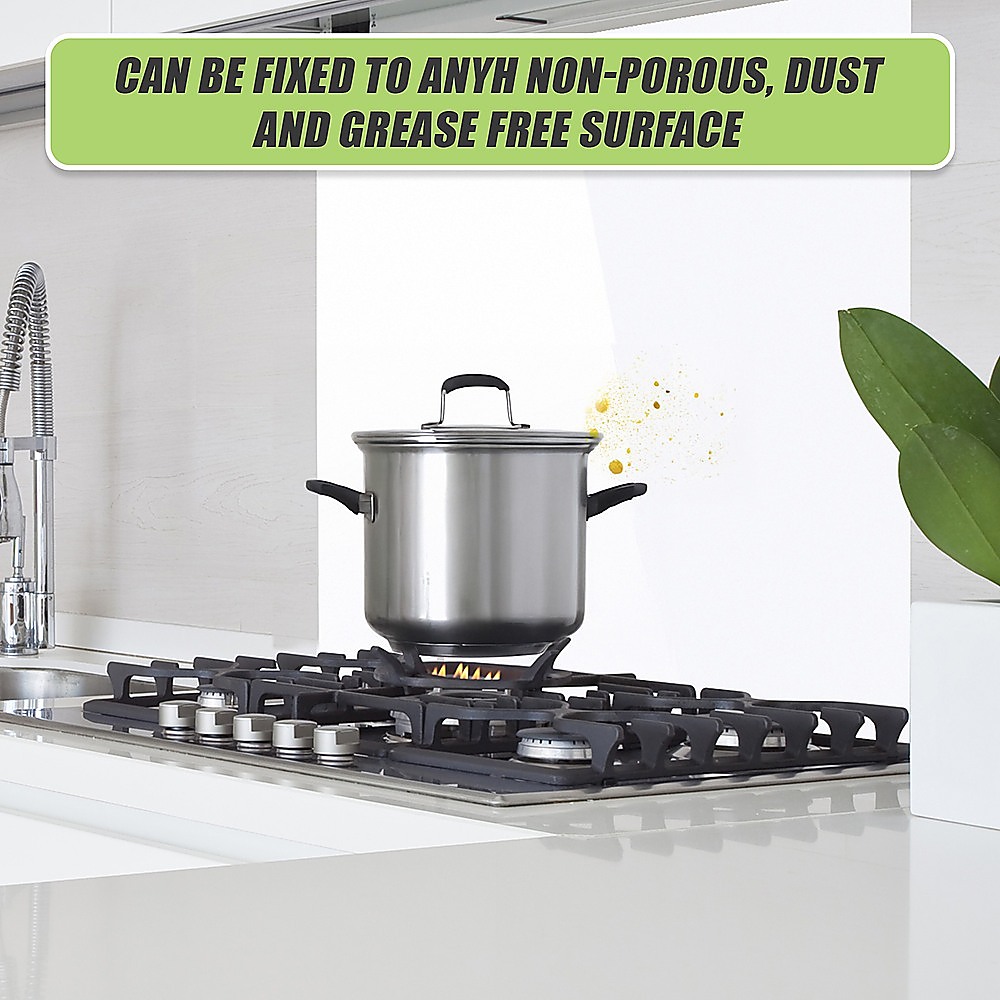 This is a toughened glass kitchen splashback measuring 90cm by 70cm. It is designed to provide a durable, clean, and stylish surface for kitchen areas, made from safety glass that is heat resistant and easy to clean. The splashback can be fixed to any non-porous, dust-free, and grease-free surface, making it suitable for various kitchen setups.