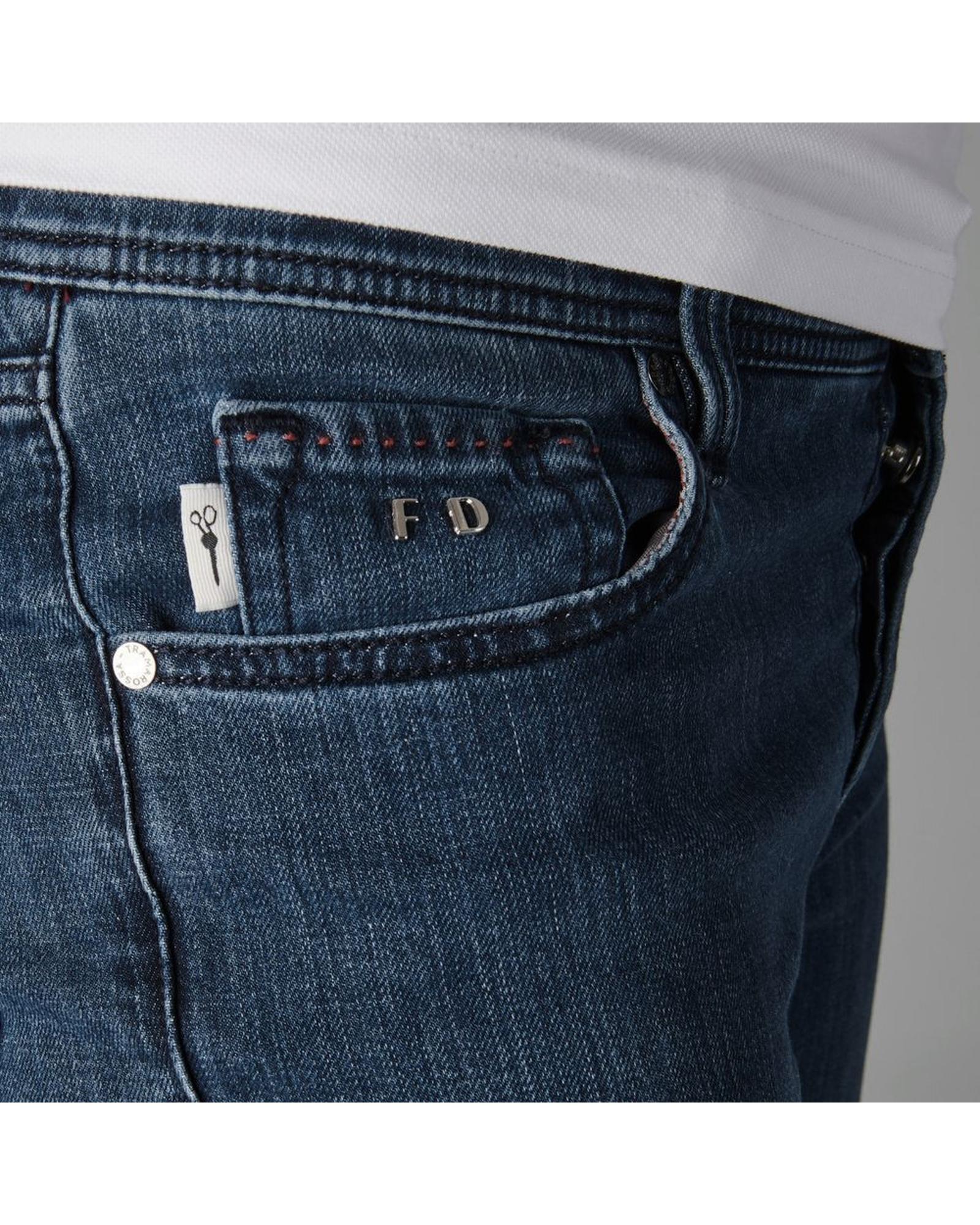 This pair of men’s blue cotton jeans offers a classic and versatile style suitable for various occasions. Crafted from stretch cotton, these jeans provide comfort and flexibility. The design features a regular fit with a five-pocket model, complemented by a blue suede patch with a metal logo on the back. The slightly faded blue wash adds a stylish touch to the overall look.