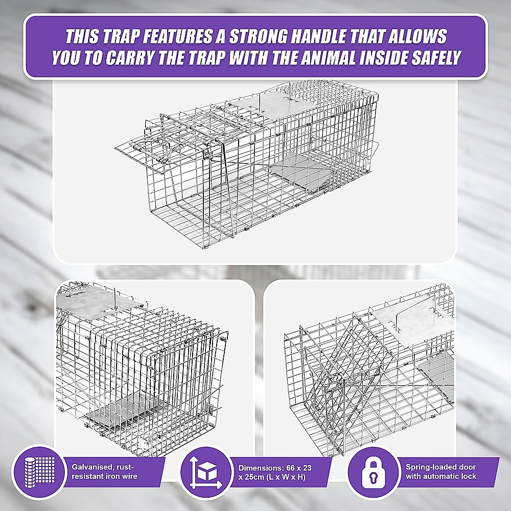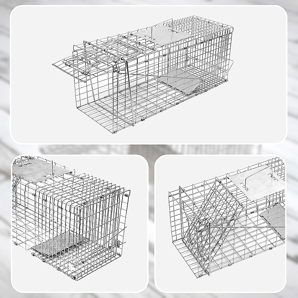 This humane trap is designed for safely capturing pests and small animals without causing harm. Made from durable, rust-resistant iron wire, it features a spring-loaded access door and an automatic lock to ensure the animal remains secure until released. The trap is easy to set, clean, and store, making it a practical solution for pest control and animal management.