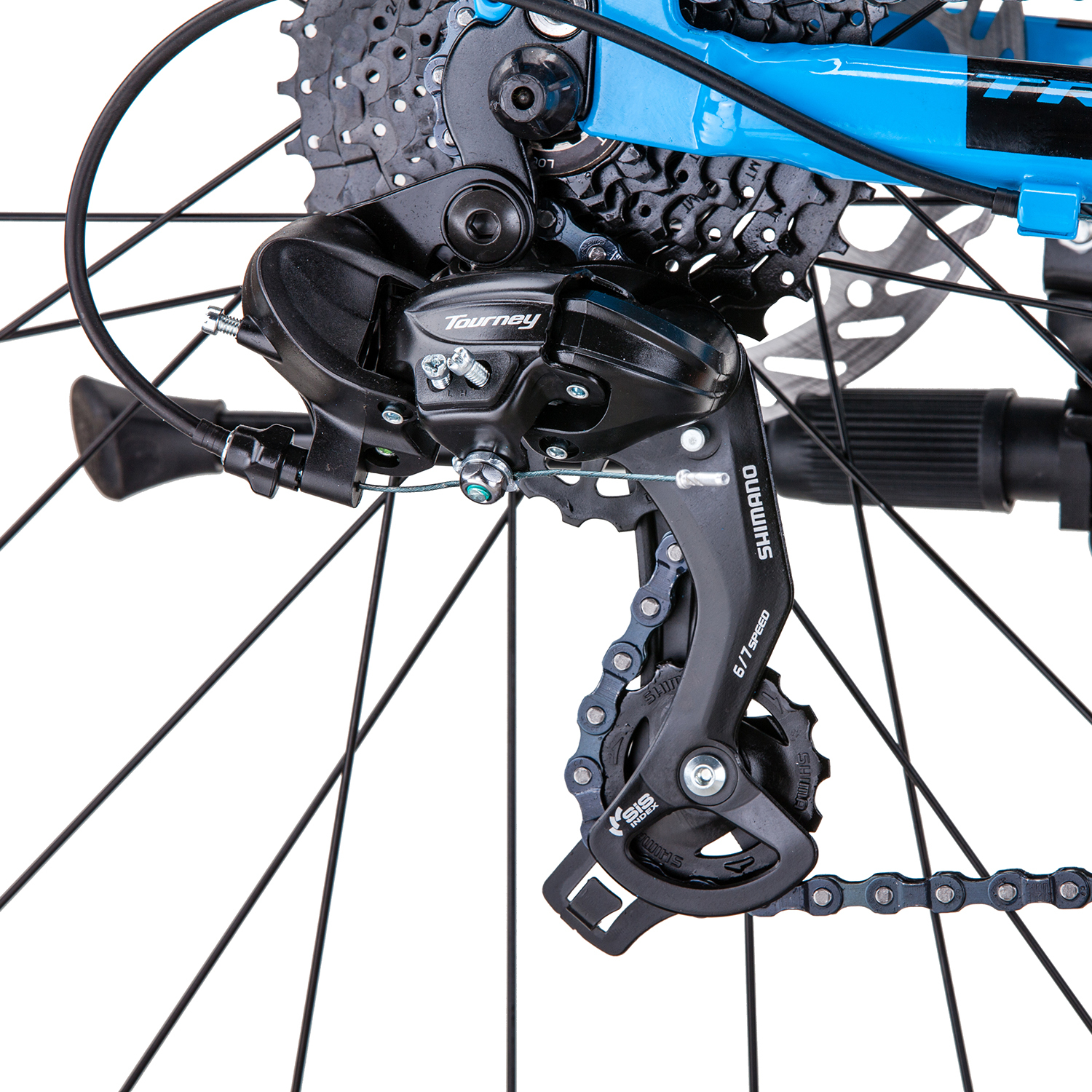 This mountain bike features a durable alloy frame with internal cable routing, designed for stability and performance on various terrains. It is equipped with a hydraulic lock-out suspension fork for smooth handling and adjustable travel. The bike comes in a stylish color combination of blue, white, and black, making it suitable for different preferences.