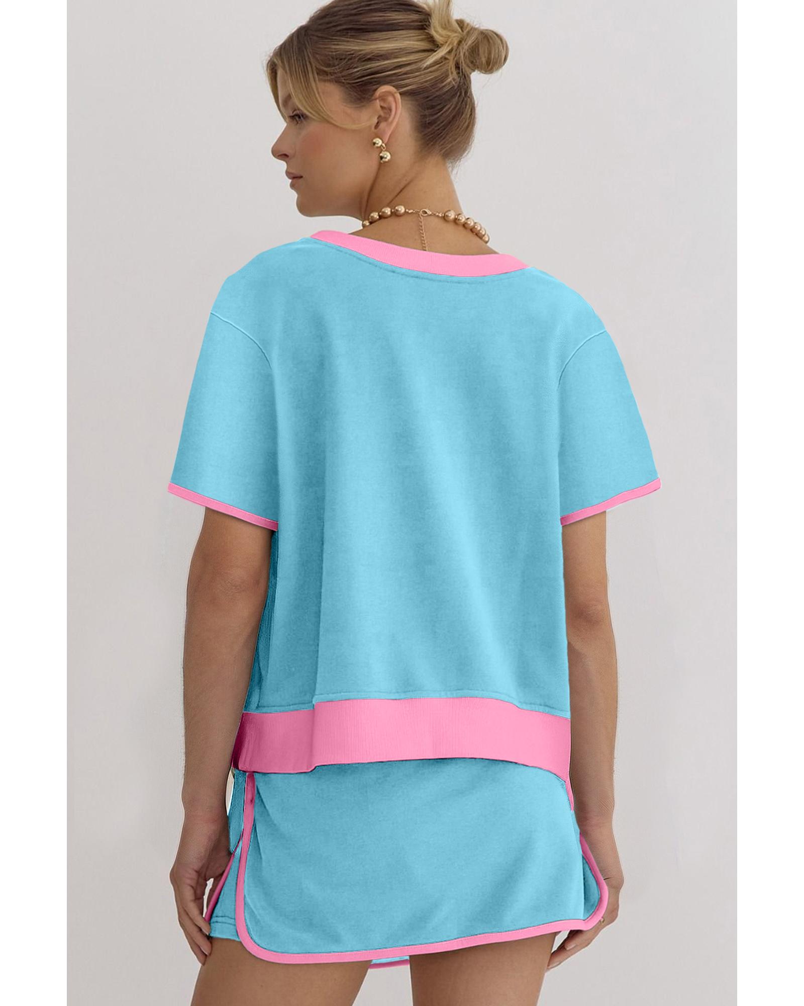 This 2-piece set features a stylish turquoise colorblock design with a drop shoulder t-shirt and a coordinating active skirt. The versatile ensemble can be worn together for a complete look or separately for different styles, perfect for showcasing your legs and adding a fashionable touch to your wardrobe.