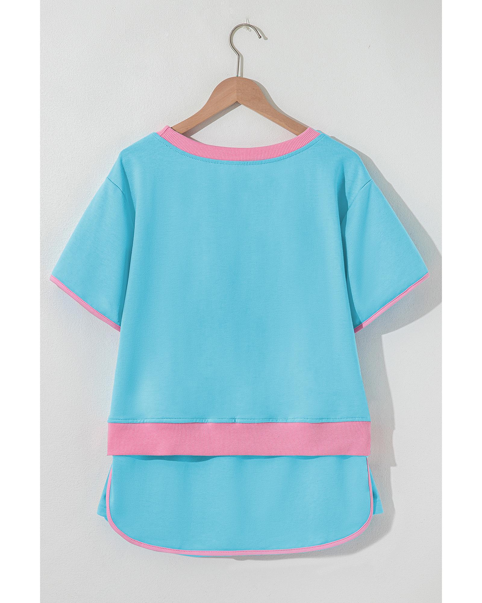 Turquoise Colorblock Edge Drop Shoulder T Shirt and Skirt 2Pcs Set – L