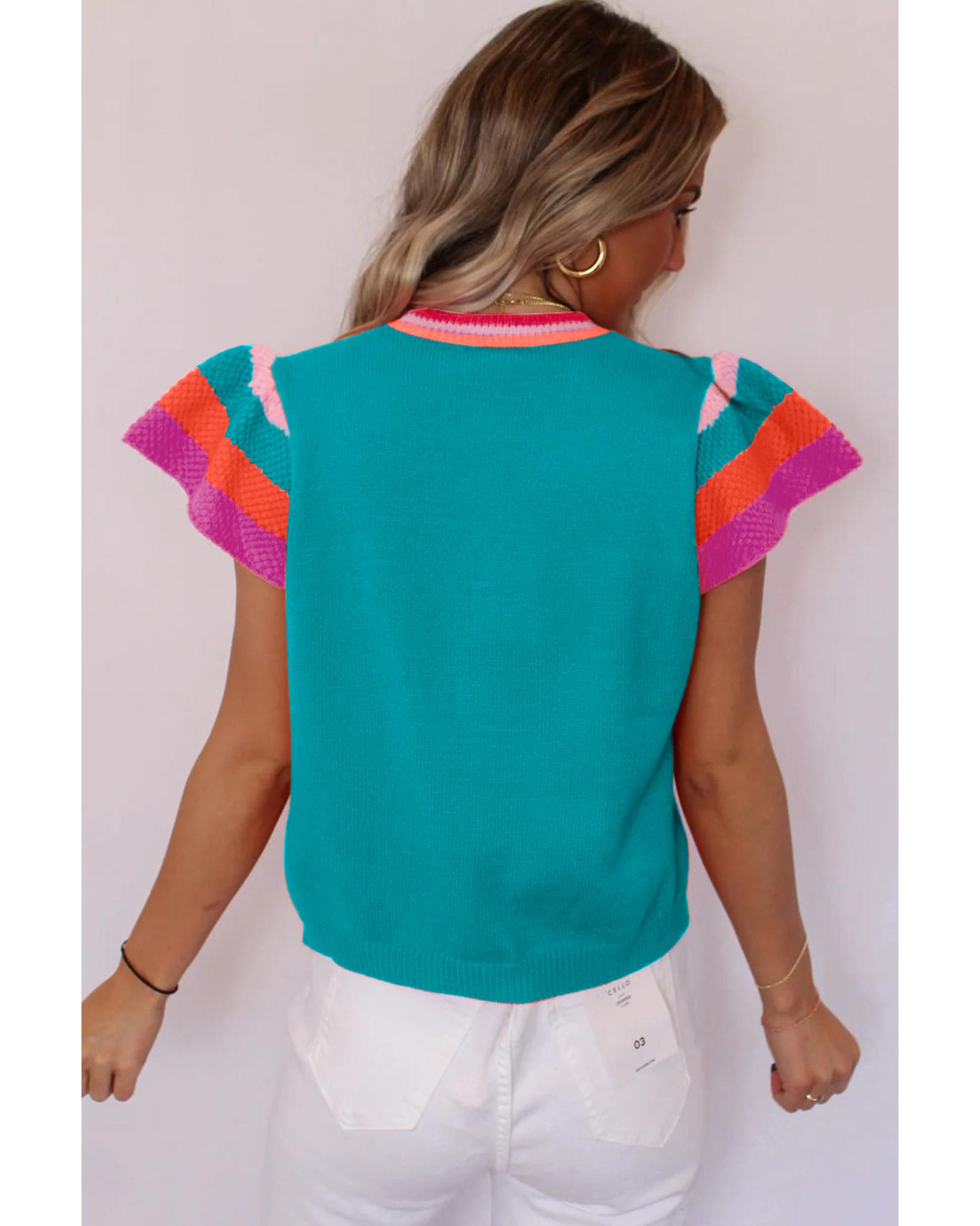 This turquoise knitted sweater T-shirt features a relaxed fit design with feminine flutter sleeves and contrasting crew neck and sleeve details. It offers a chic and versatile style suitable for warm weather and can be worn across all seasons.