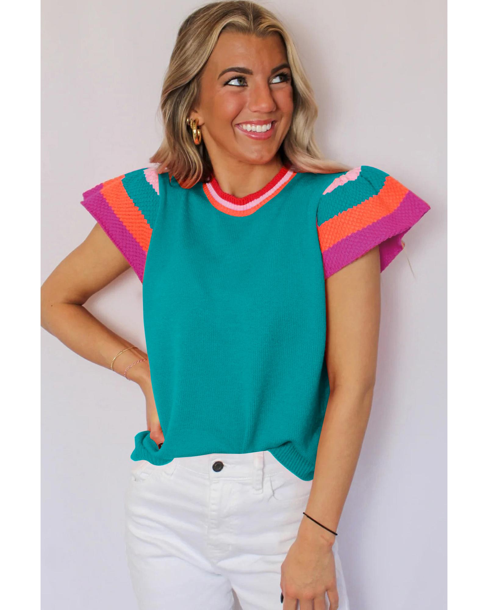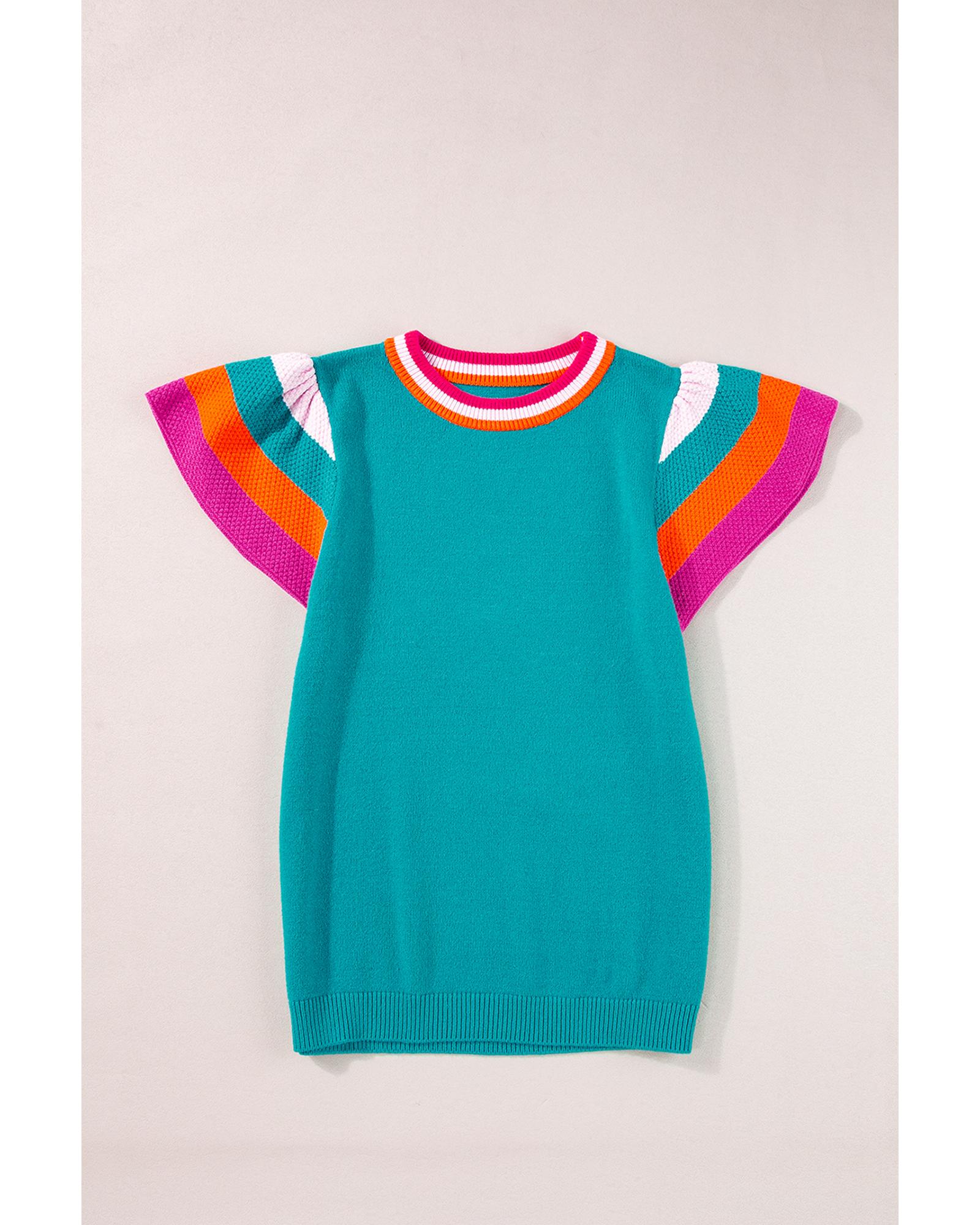 This turquoise knitted sweater T-shirt features a relaxed fit design with feminine flutter sleeves and contrasting crew neck and sleeve details. It offers a chic style suitable for warm weather and can be worn across all seasons, making it a versatile addition to your wardrobe.