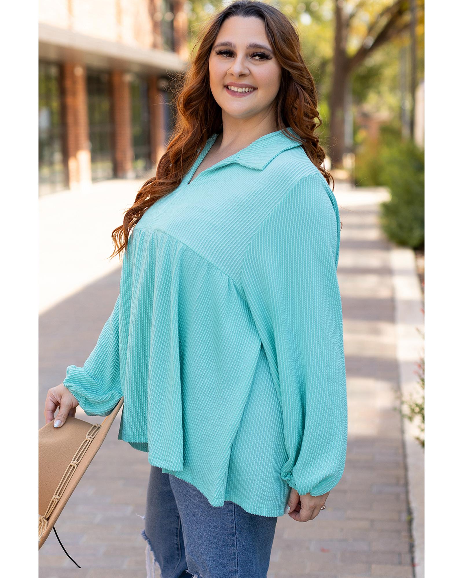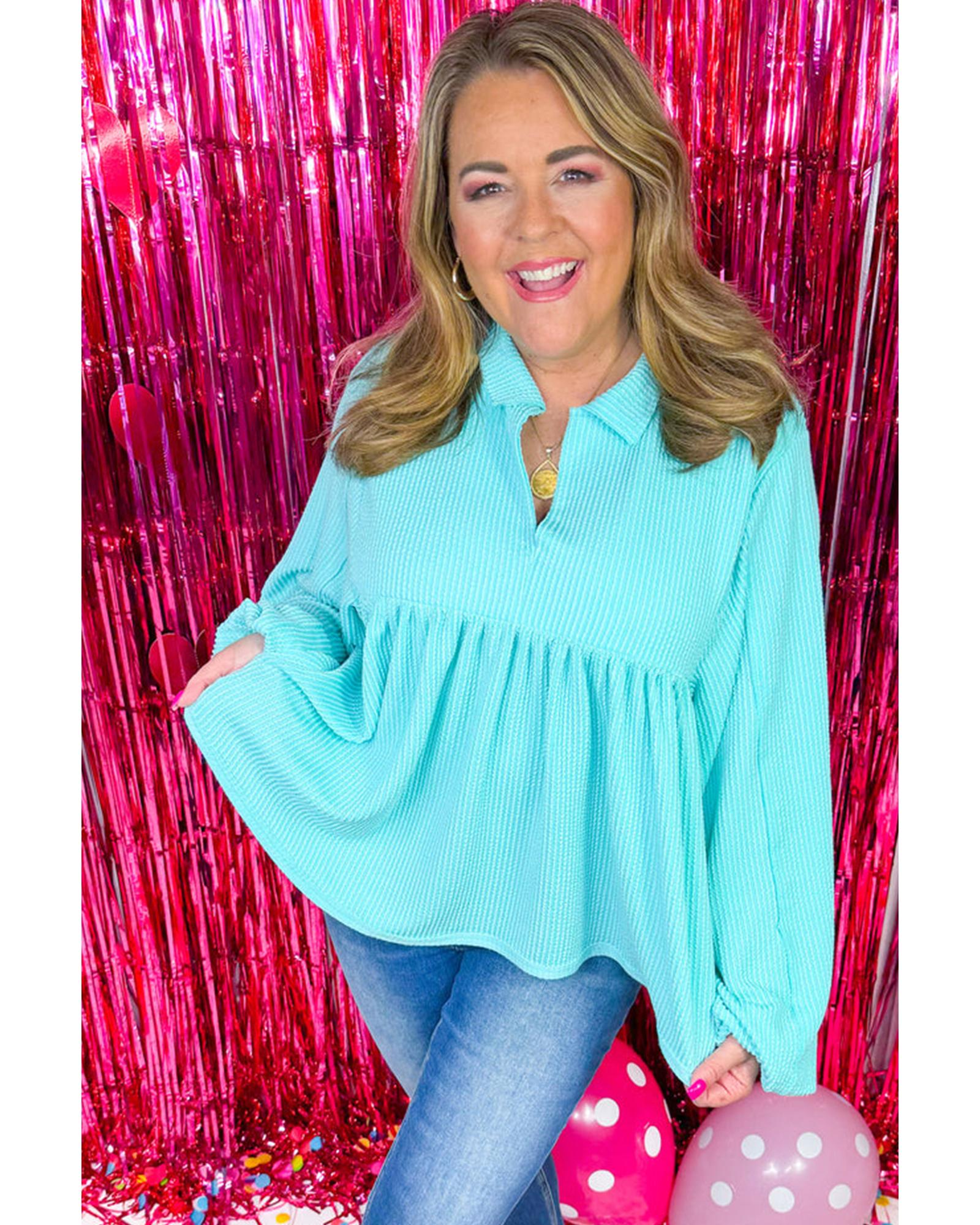 Turquoise Cordrd Balloon Sleeve Collar Plus Babydoll Top – 3X