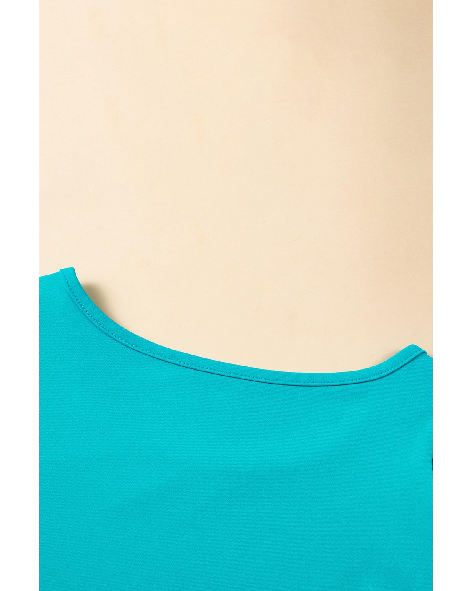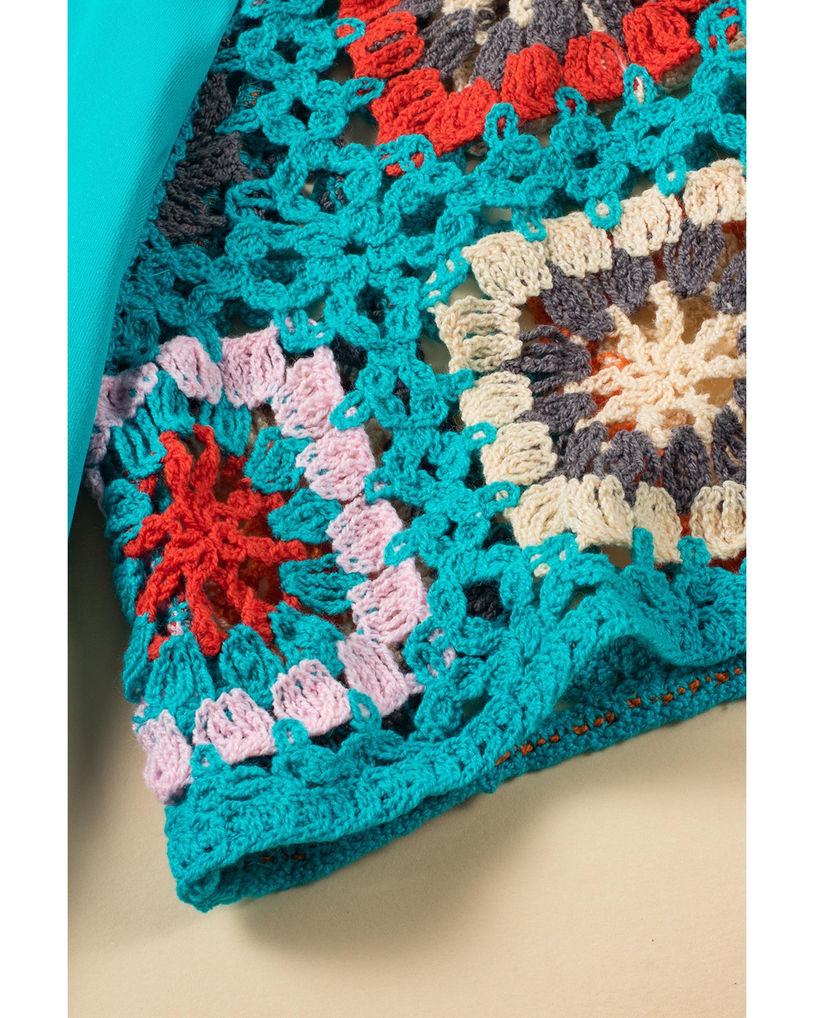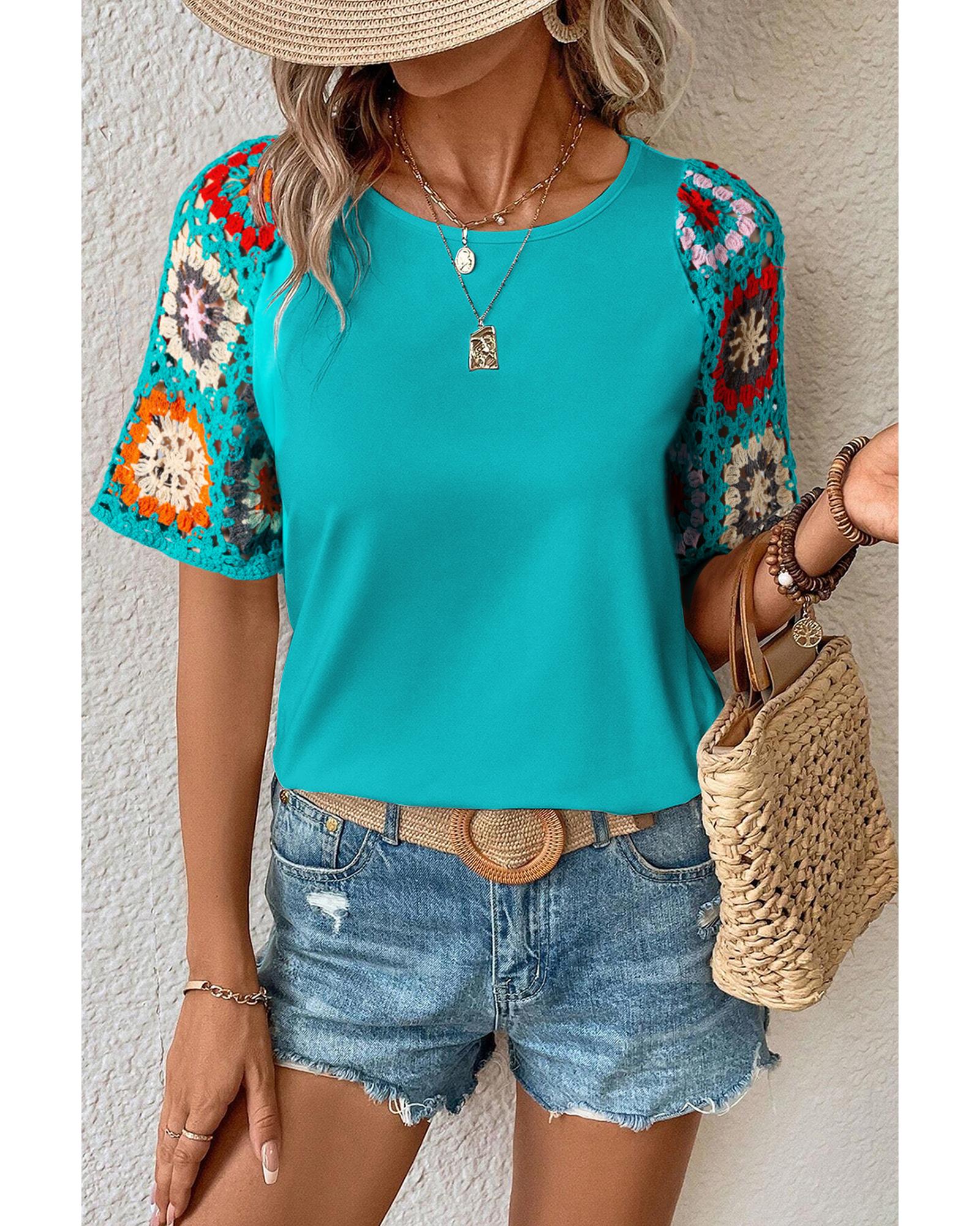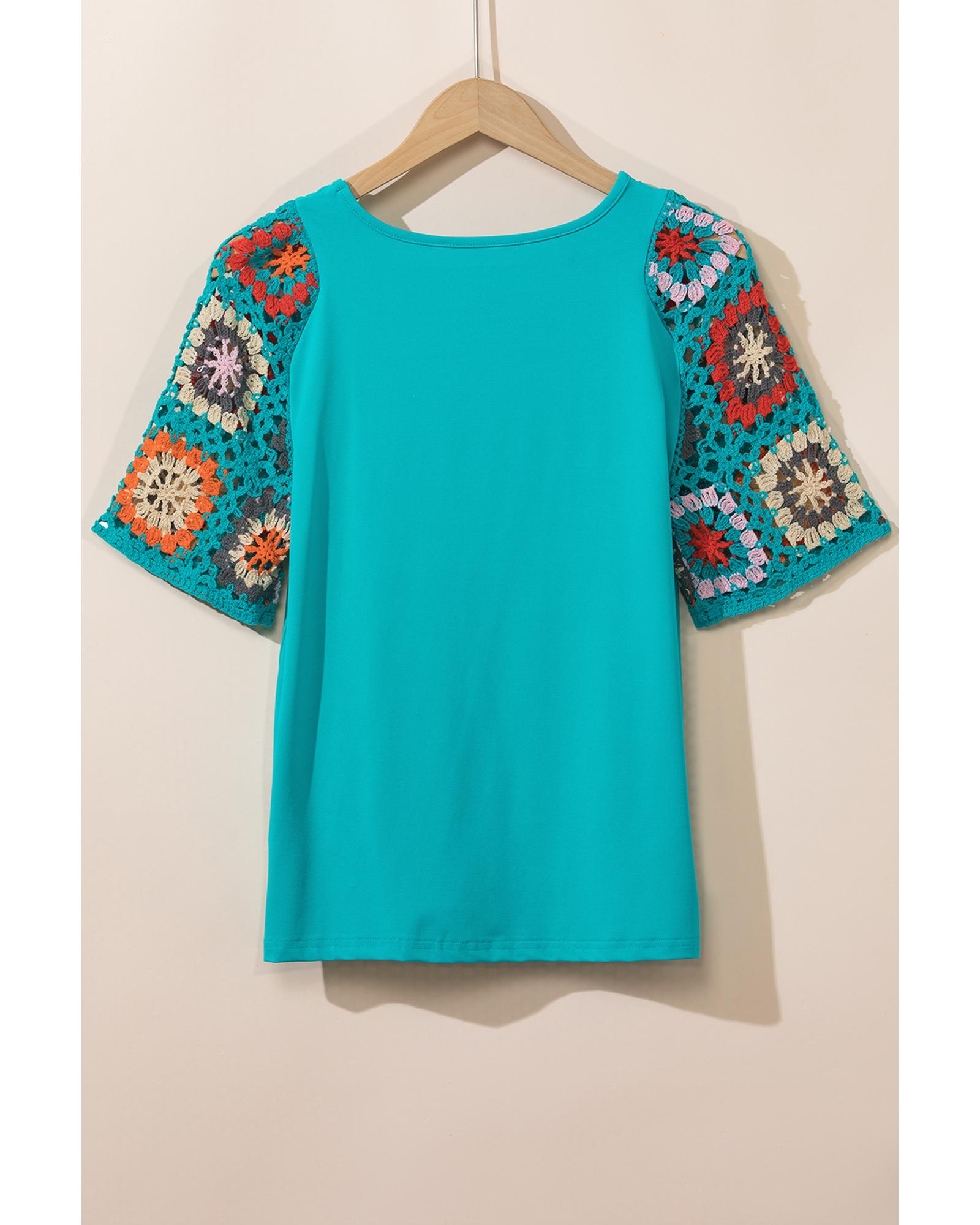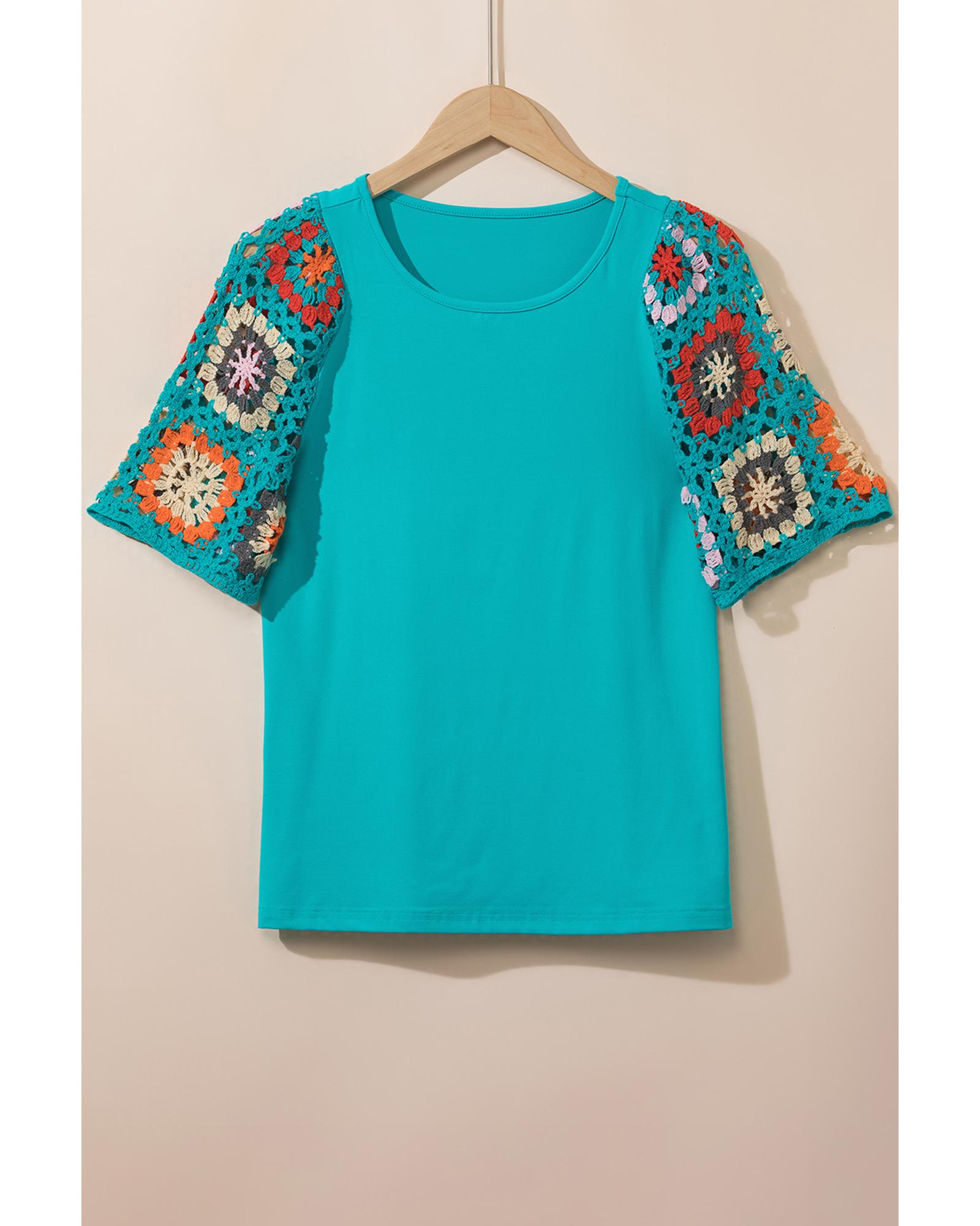 This turquoise floral crochet short sleeve top features a trendy fitted design with a relaxed silhouette, making it a stylish and comfortable choice for casual wear. The classic round neck and floral crochet sleeves add a touch of elegance to the overall look. Crafted from a high-elasticity stretch fabric, it offers a comfortable fit and ease of movement. Available in various sizes, it is suitable for those seeking a chic and versatile top.