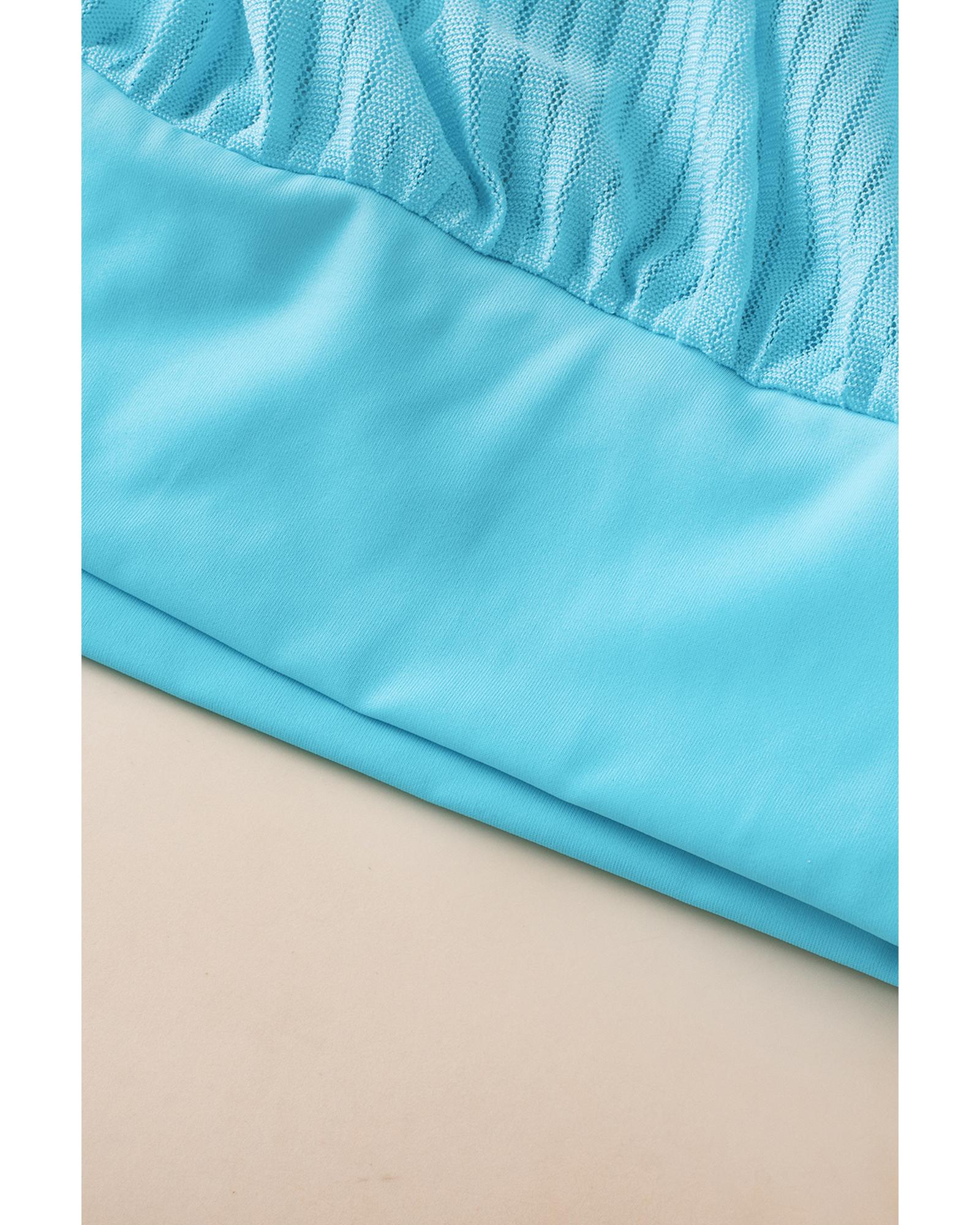This tankini swimsuit features a trendy and flattering design with a turquoise striped mesh pattern and a knotted hem detail on the top. It is crafted to provide a stylish and comfortable fit, making it suitable for various beach or poolside occasions.