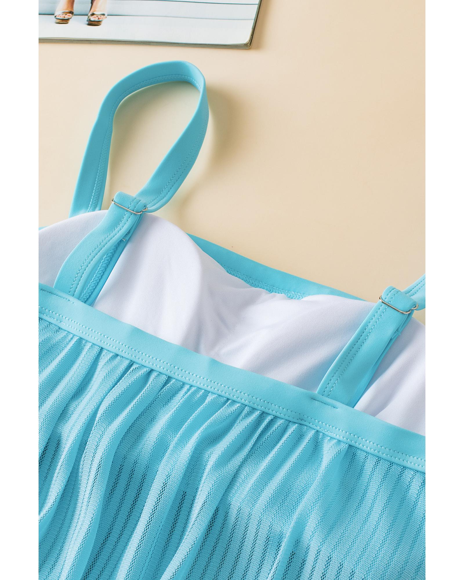 This tankini swimsuit features a trendy fitted design with a turquoise striped mesh pattern and a knotted hem detail on the top. It offers a high-rise cut for easy wear and adjustable straps for a customizable fit. The removable padded cups provide additional support and coverage, making it a versatile choice for various swimwear styles.