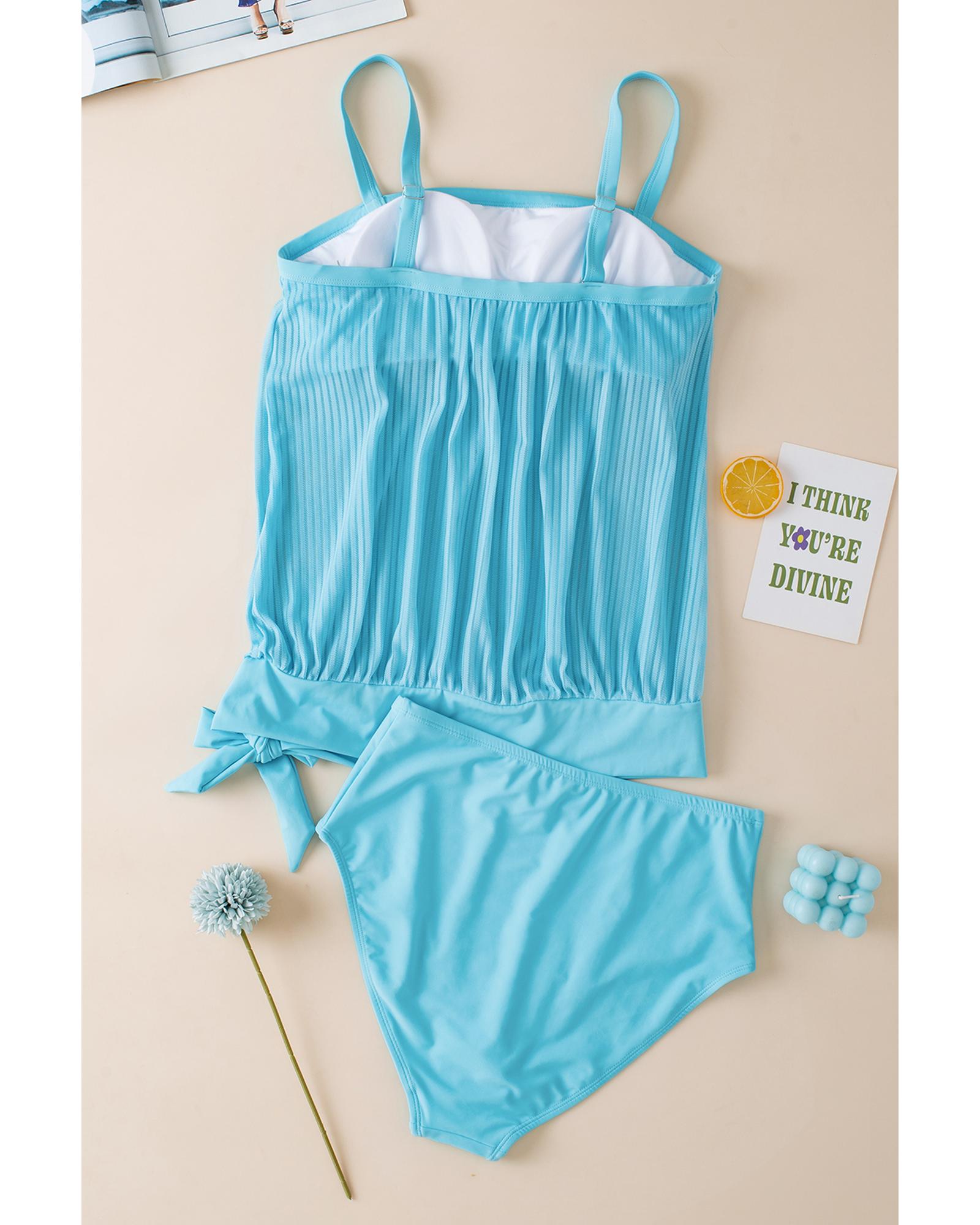 This tankini swimsuit features a trendy and flattering design with a turquoise striped mesh pattern and a knotted hem detail. It offers a high-rise fit with adjustable straps and removable padded cups for customizable comfort and support. Perfect for pairing with coverups, this versatile piece combines style and functionality for your swimwear collection.