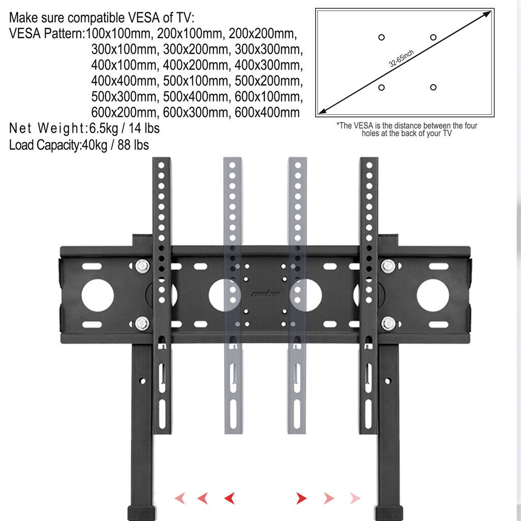 This TV stand base mount bracket is designed to support a wide range of flat-screen TVs from 32 to 65 inches. It offers adjustable height and a swivel function to enhance your viewing experience. The sturdy construction provides stability and can hold up to 88 pounds, making it suitable for various TV models without wall mounting.