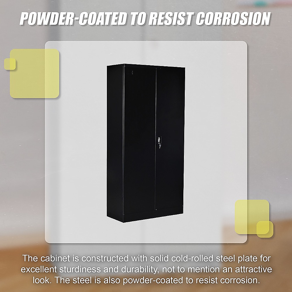 This two-door lockable file cabinet offers a versatile storage solution suitable for home or office use. It features multiple shelves with varying heights, providing ample space for organizing documents and other items. Constructed from durable steel with a powder-coated finish, it combines sturdiness with resistance to corrosion. The cabinet includes a lock and key for added security and is designed for easy assembly.