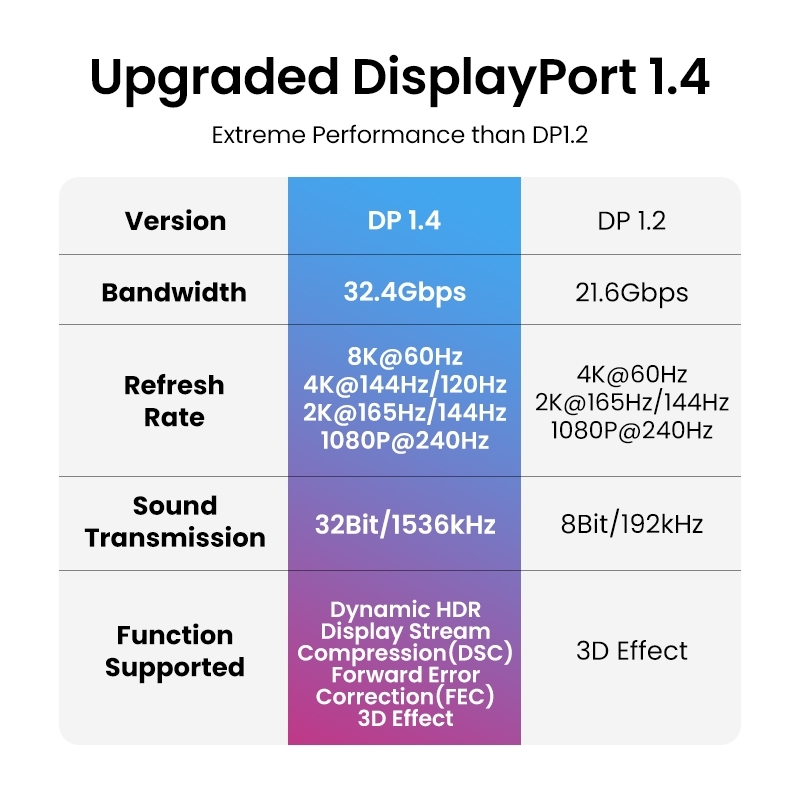 - Supports transmission speeds up to 32.4Gbps and resolutions up to 8K at 60Hz, including 4K at 144Hz and 2K at 240Hz.