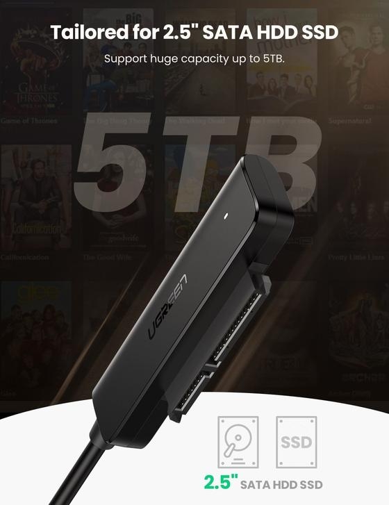 This product is a USB-A to 2.5-inch SATA converter cable designed for quick and easy access to SSDs and HDDs. It allows for data transfer, hard drive upgrading, cloning, data recovery, and expanding storage without the need to open a computer case. The device offers a simple, plug-and-play experience with no additional power supply required for 2.5-inch drives.