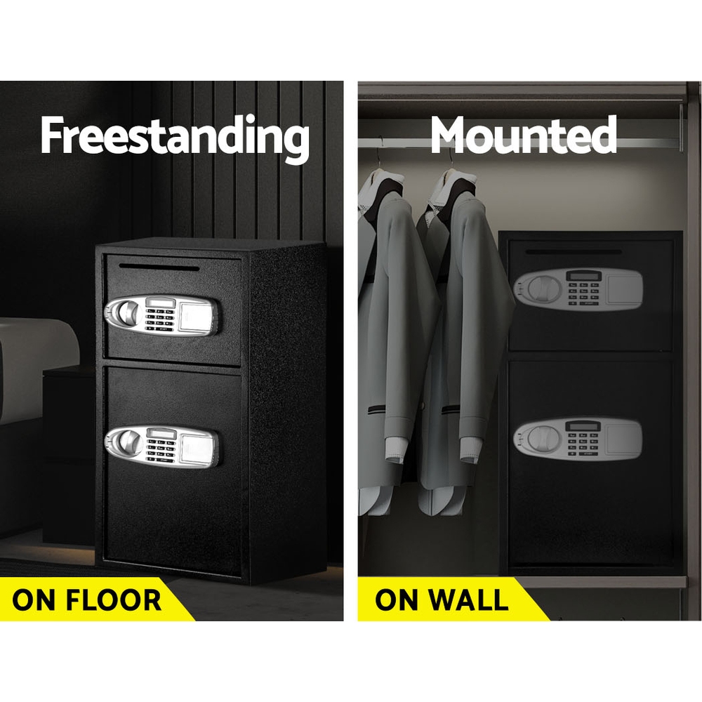 This security safe box features a double-door design with enhanced security measures, making it suitable for protecting valuables at home or in the office. Constructed with a solid steel frame and powder-coated finish, it offers durability and tamper resistance. The safe provides two access options: a digital keypad with LCD display and an emergency key, ensuring reliable security and convenience. It can be used as a freestanding unit or wall-mounted, with pre-drilled holes for easy installation.