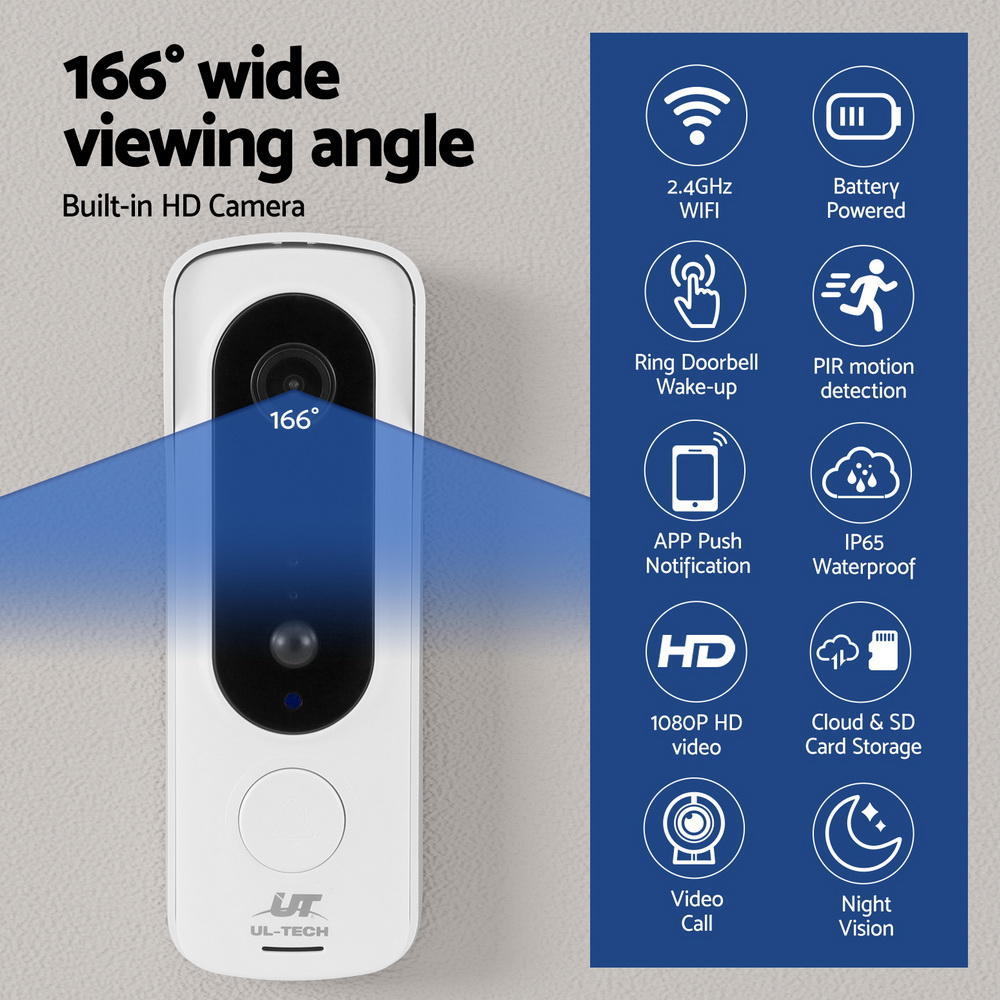 This wireless video doorbell features high-definition video, wide-angle viewing, and advanced monitoring capabilities. It offers clear day and night vision, two-way audio communication, and supports multiple storage options. The device is designed for easy remote access and sharing among users, providing enhanced security and convenience.