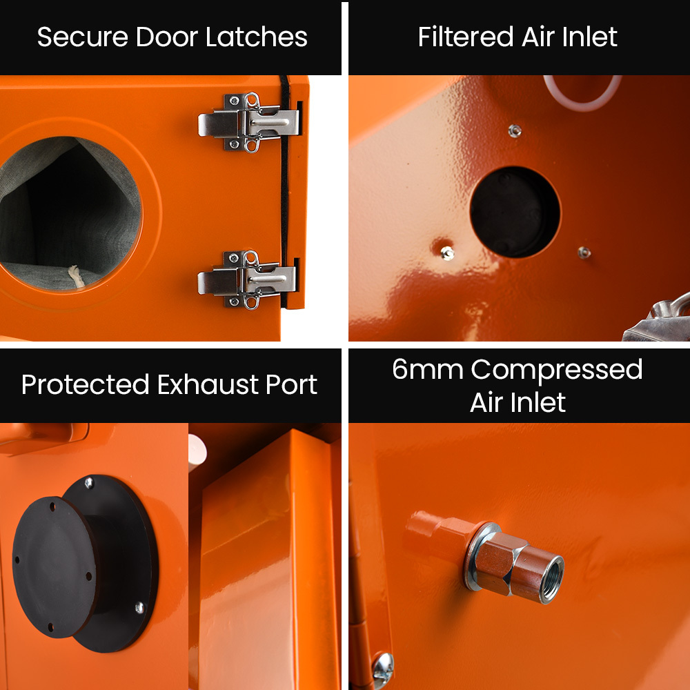 - Compatible with multiple blasting media types such as glass bead, silicon carbide, alumina, walnut shell, and brass bead