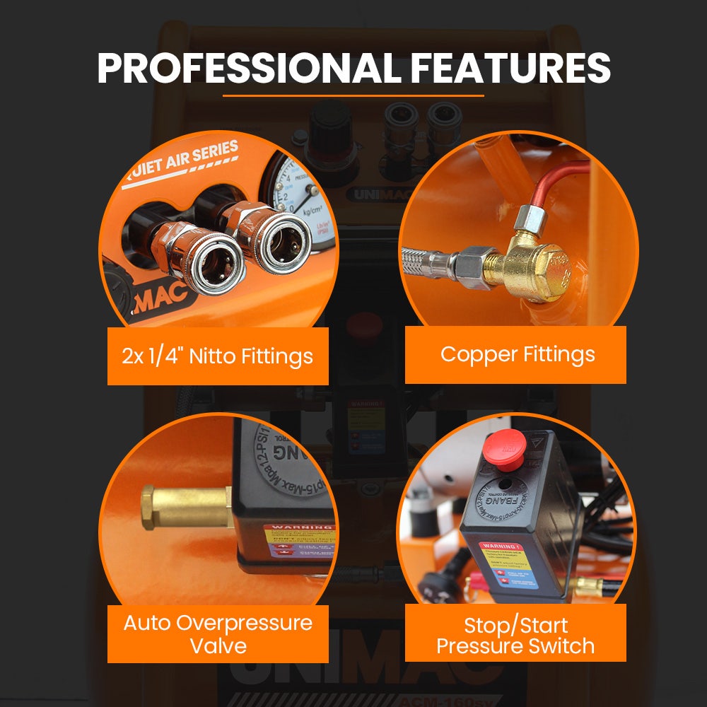 Unimac 16L Silent Oil-Free Electric Air Compressor, 116PSI Portable with Wheels and Handle, Twin Nitto Outlets for Airtools, Tyre Inflation