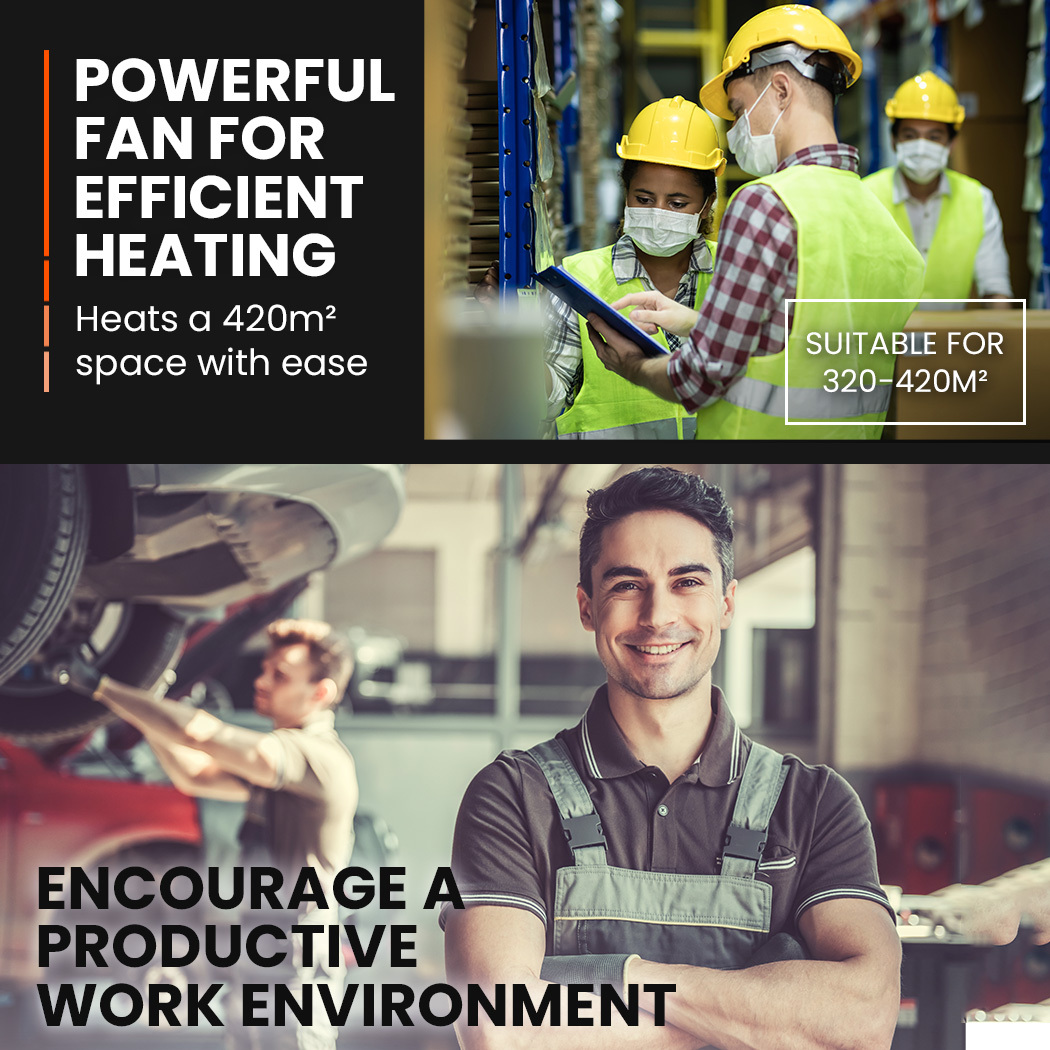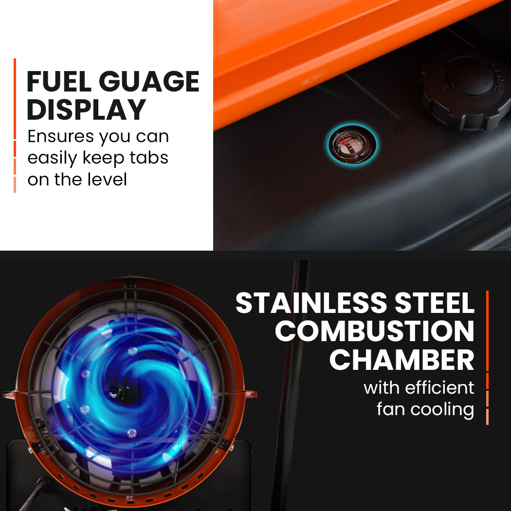 This portable industrial diesel space heater offers a reliable and efficient heating solution suitable for various commercial, agricultural, and industrial environments. It features a high heat output, easy mobility, and versatile fuel compatibility, making it ideal for keeping large spaces warm and facilitating quick drying processes.