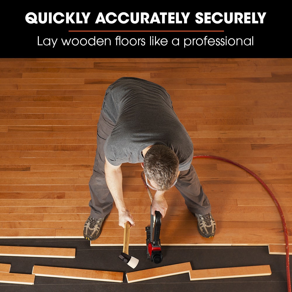 This pneumatic flooring air gun driver is designed for heavy-duty use, capable of driving nails and staples into hardwood flooring with ease. It features an ergonomic handle for comfortable operation and includes an adaptor foot to protect pre-finished floorboards. The tool is lightweight yet powerful, making flooring installation more efficient and less tiring.