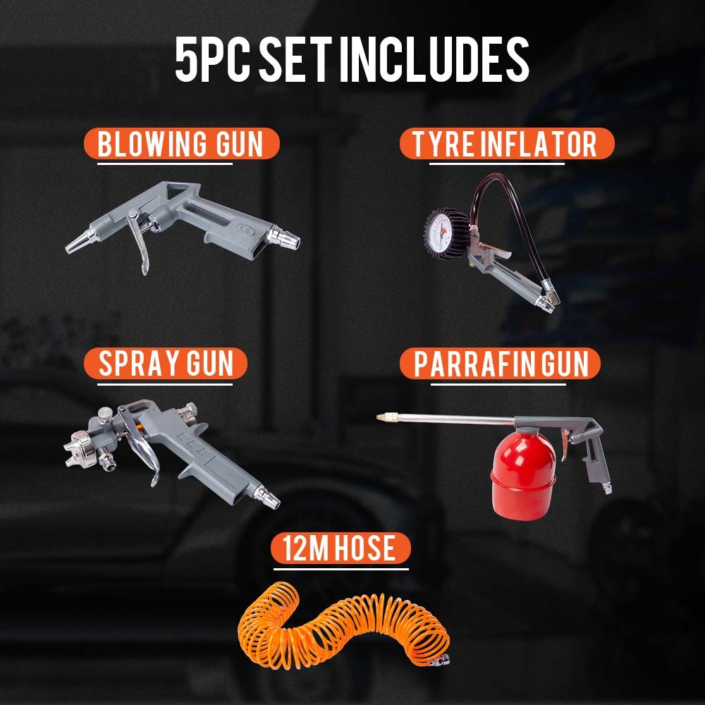 - Includes five air tool attachments: spray gun, paraffin gun, tyre inflator, blowing gun, and flexible hose