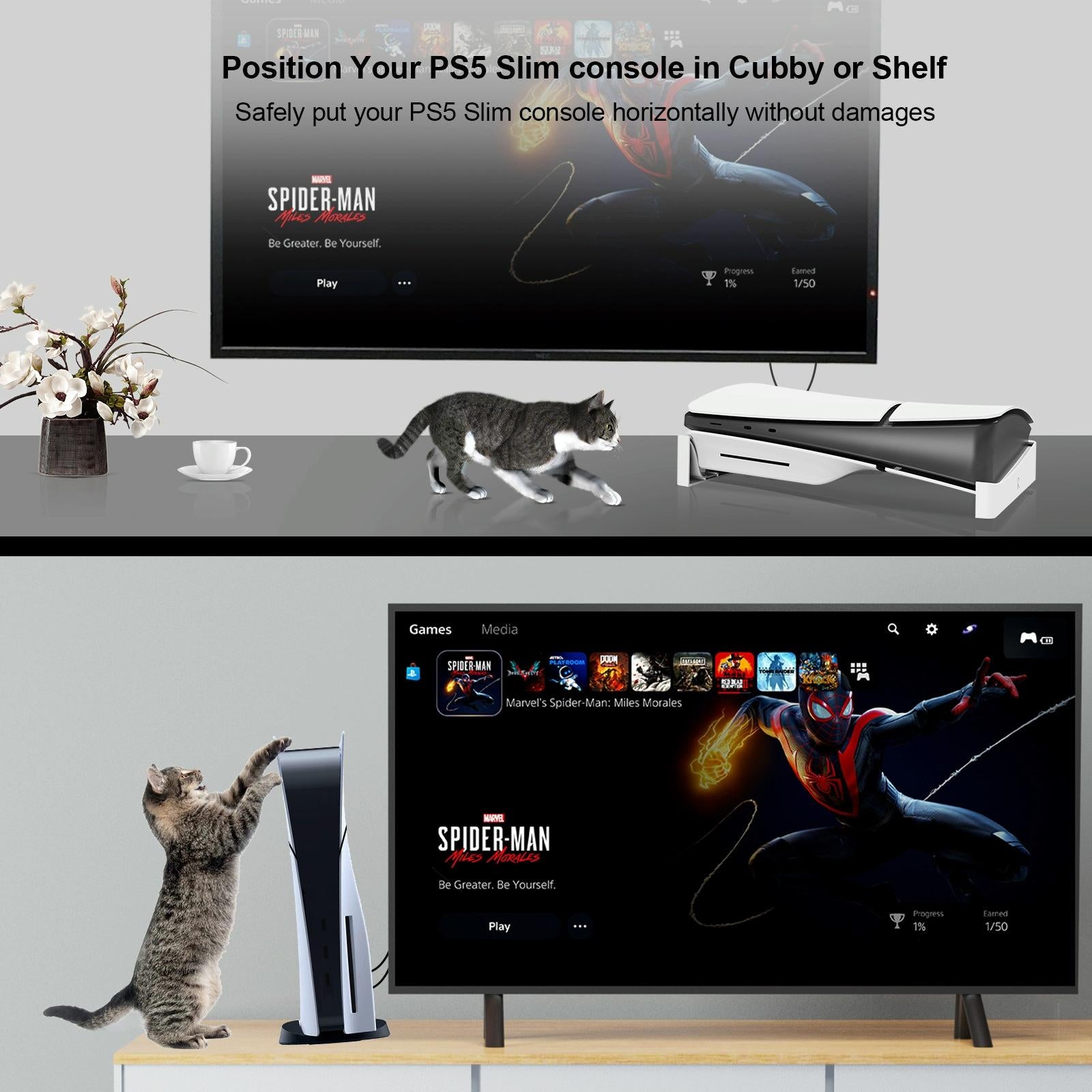 This universal horizontal stand is designed for the PS5 Slim digital and optical drive versions. It provides a safe and stable way to position your console horizontally, preventing potential damage and ensuring proper heat dissipation. The stand is suitable for placement on cabinets or shelves without causing damage to surfaces. Made from durable ABS material, it offers reliable support for your gaming setup.