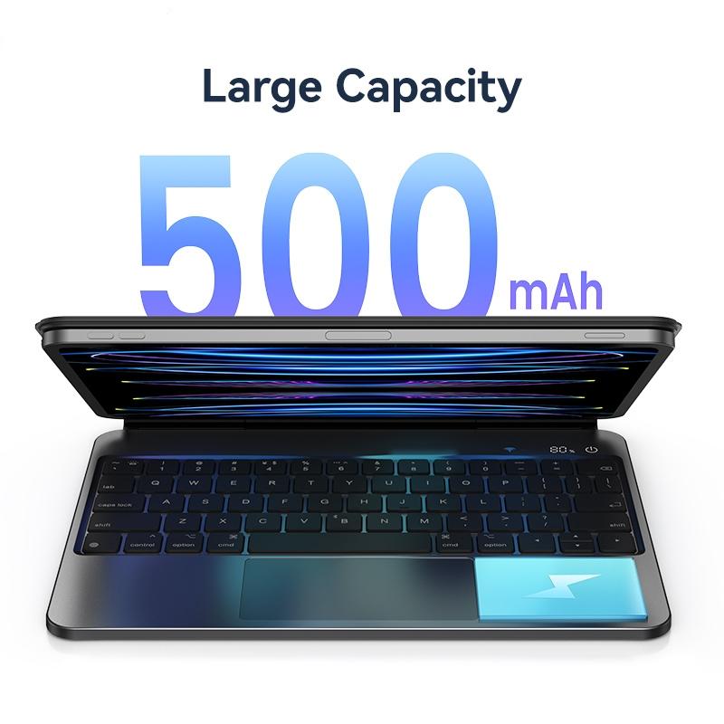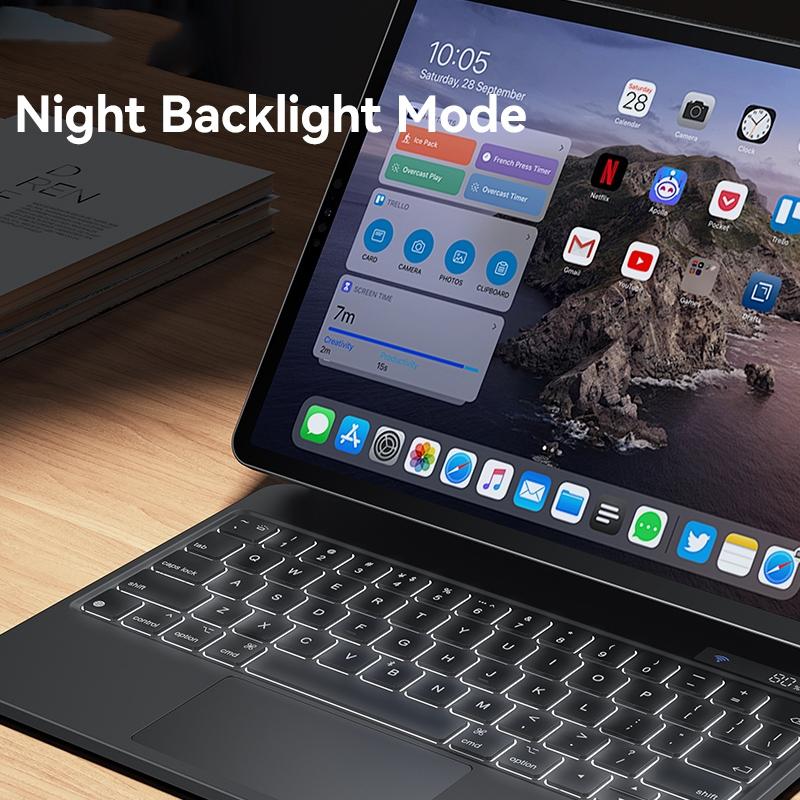 This product is a versatile 3-in-1 accessory designed for iPad Pro 12.9. It combines a keyboard, magnetic stand, and protective cover into a single device, offering convenience and functionality. The suspension stand features an adjustable viewing angle, and built-in magnets enable automatic attachment. An LED digital display shows keyboard status, while scissors-type keys provide flexible and comfortable typing. The backlight mode allows for use in low-light conditions, and the upgraded Bluetooth 5.2 ensures stable connectivity. A large 500mAh battery supports extended usage.