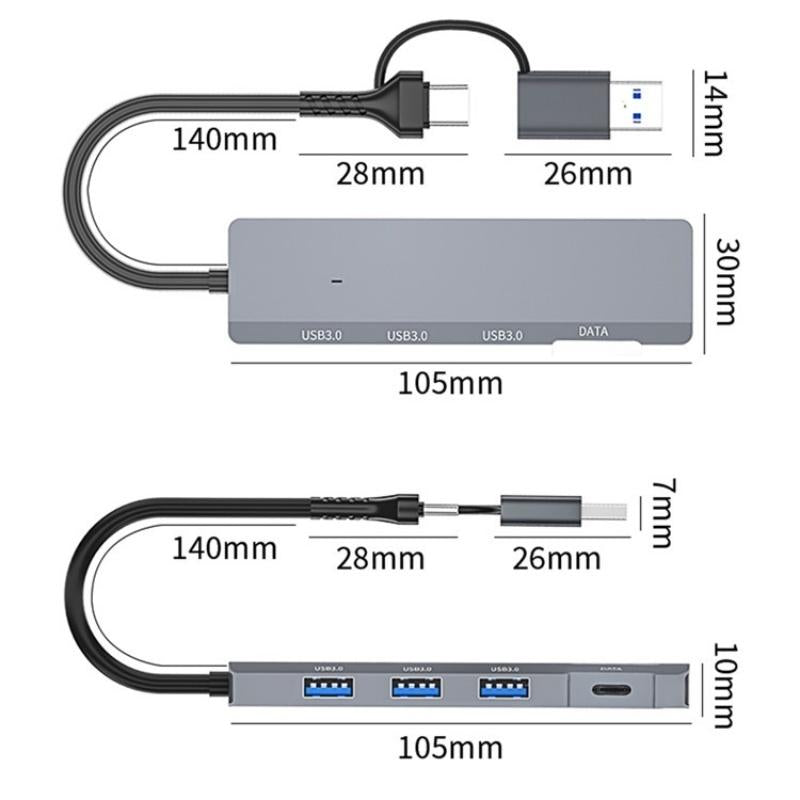This USB / Type-C Hub Adapter provides multiple connectivity options with three USB 3.0 ports and one Type-C data port, suitable for expanding the connectivity of laptops, tablets, and smartphones. It features fast data transfer speeds and a durable aluminum alloy shell for long-lasting use.