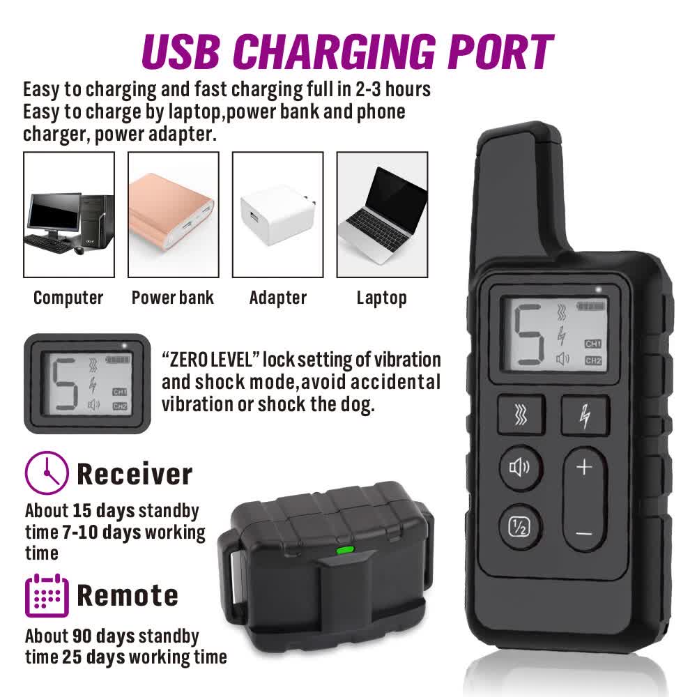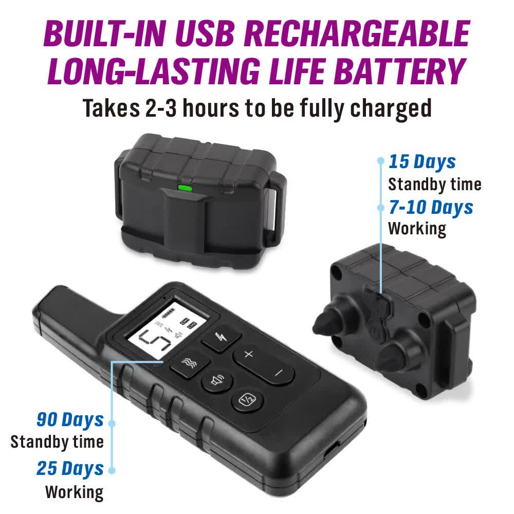 - Three training modes: shock, vibration, and tone