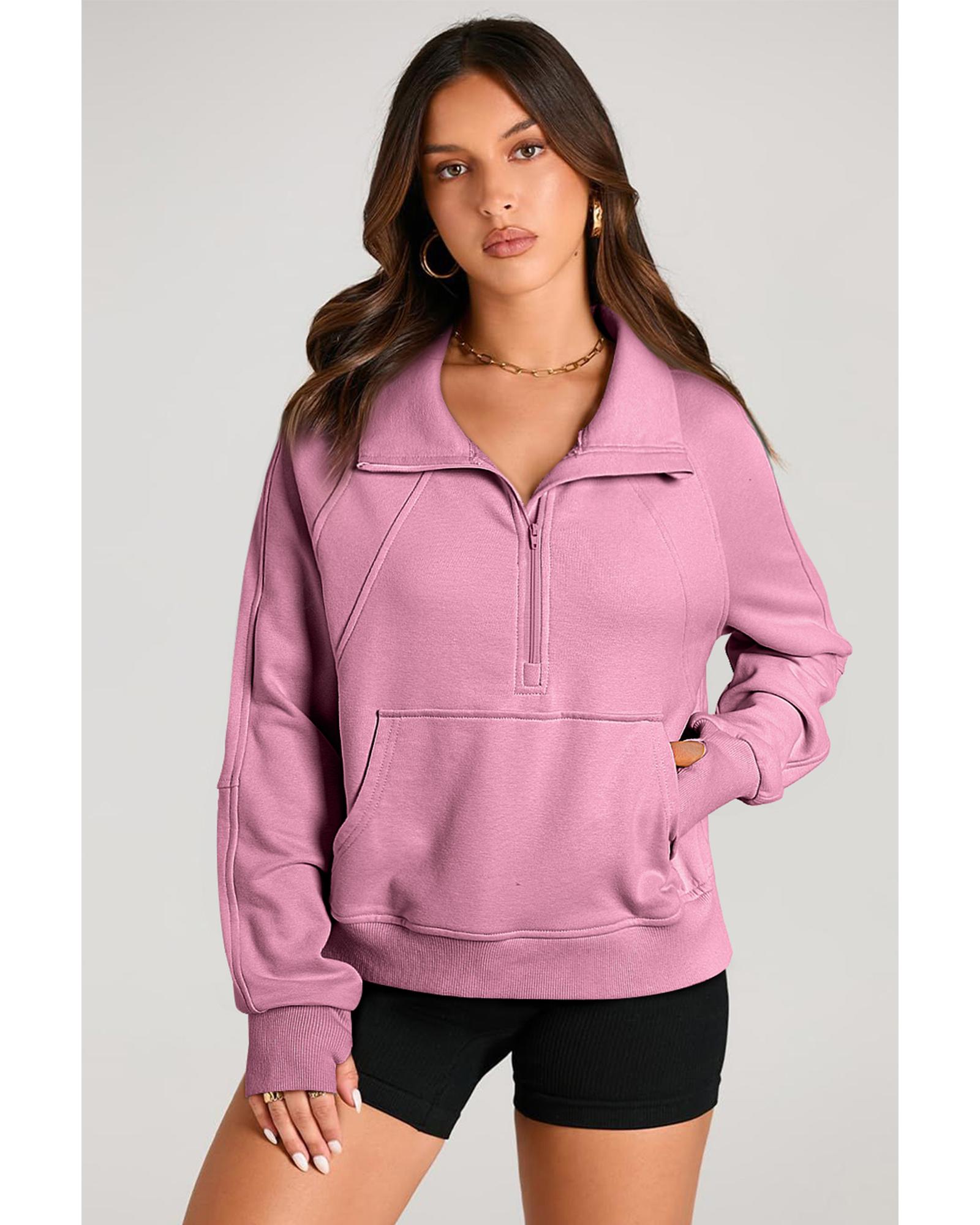 This sweatshirt features a trendy fitted design with a stand neck and quarter zip for easy layering. It includes a kangaroo pocket for convenient storage and offers a versatile plain style suitable for various casual occasions. The piece pairs well with jeans or casual pants and is available in multiple sizes.