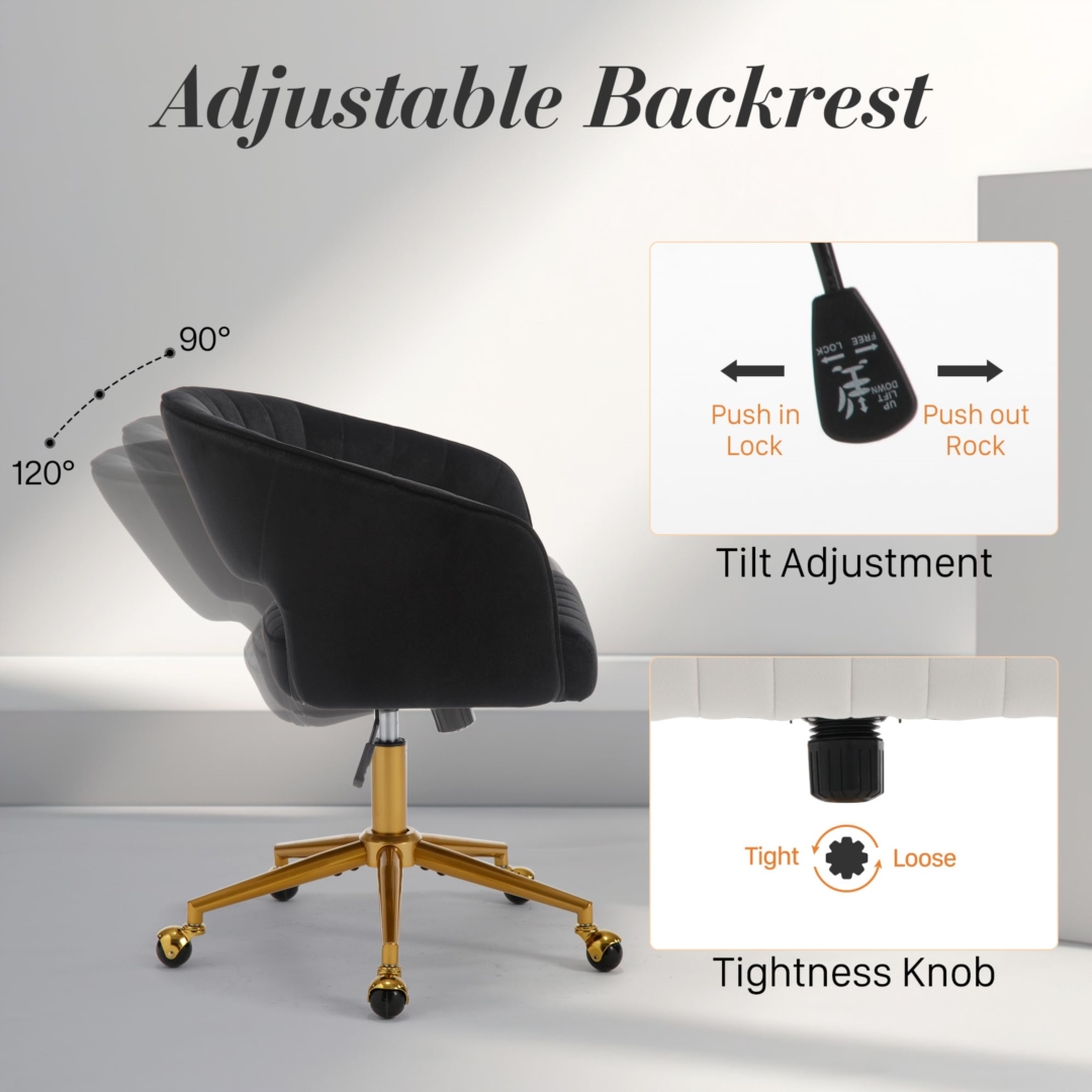 This office chair combines comfort, style, and functionality, making it an ideal addition to your home or workspace. It features a plush velvet upholstery, an ergonomic hollow-back design for breathability, and a spacious backrest with supportive armrests. The stylish design is complemented by a durable metal base and smooth-rolling wheels, ensuring stability and effortless mobility.
