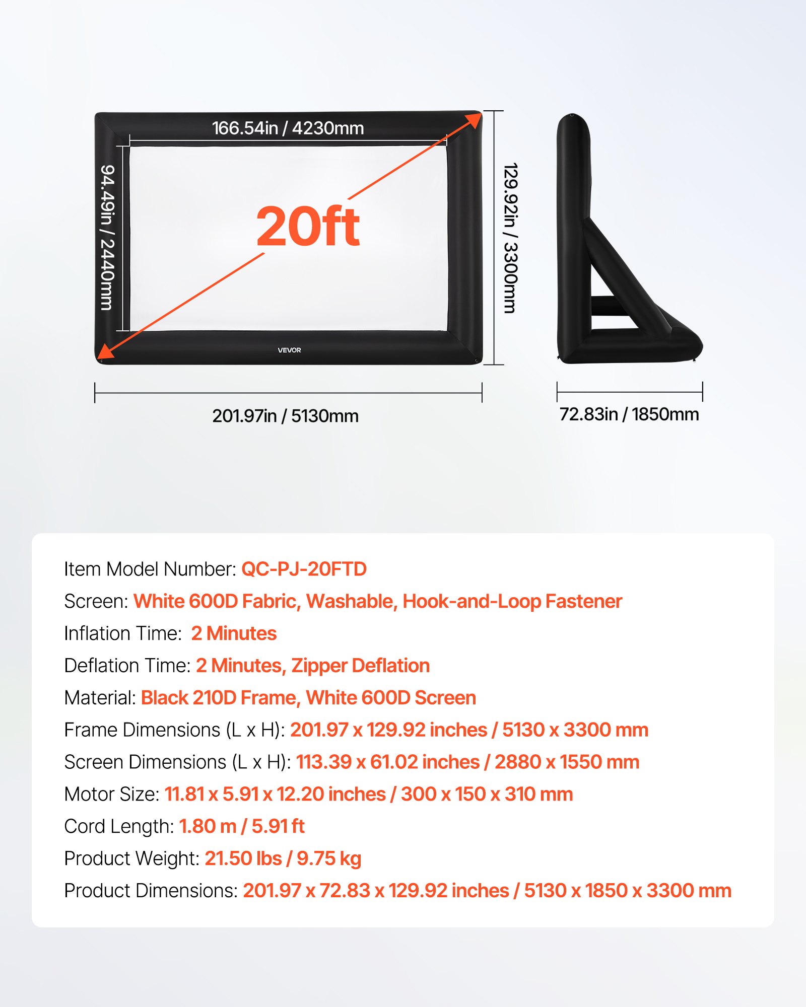 - Screen Size: 20 feet in length, 16:9 aspect ratio