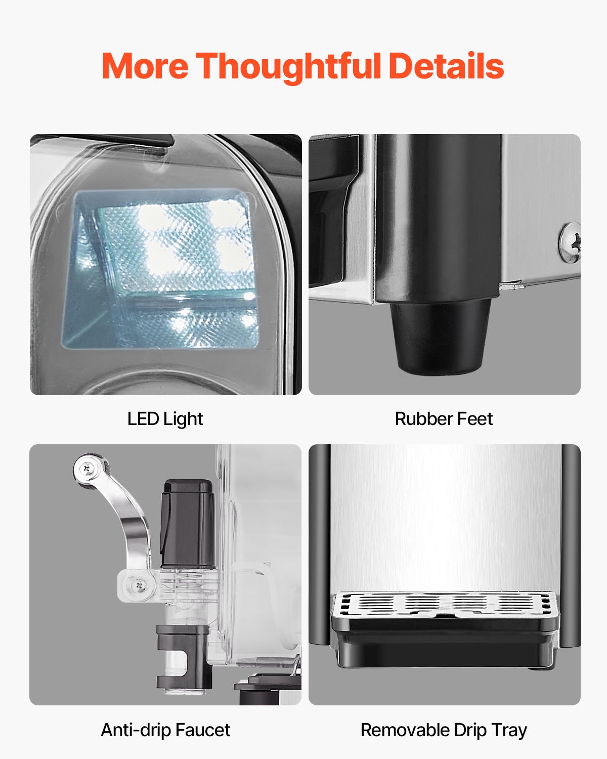 This upgraded slushy machine is designed for making a variety of cold beverages, including juices, tea, margaritas, and iced coffee. It features adjustable temperature control to achieve the desired consistency, making it suitable for different drink types and preferences.