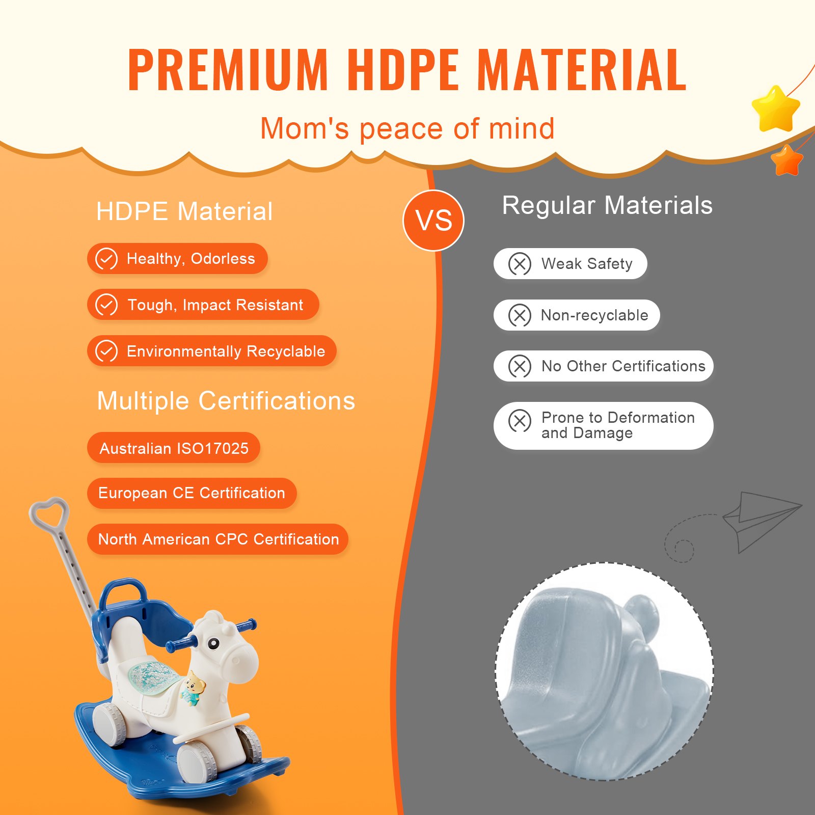 VEVOR 4 in 1 Rocking Horse for Toddlers 1-3 Years, Baby Rocking Horse with Detachable Balance Board, Push Handle and 4 Smooth Wheels, Support up to 80 lbs HDPE Kids Ride on Toy with Sound, Blue