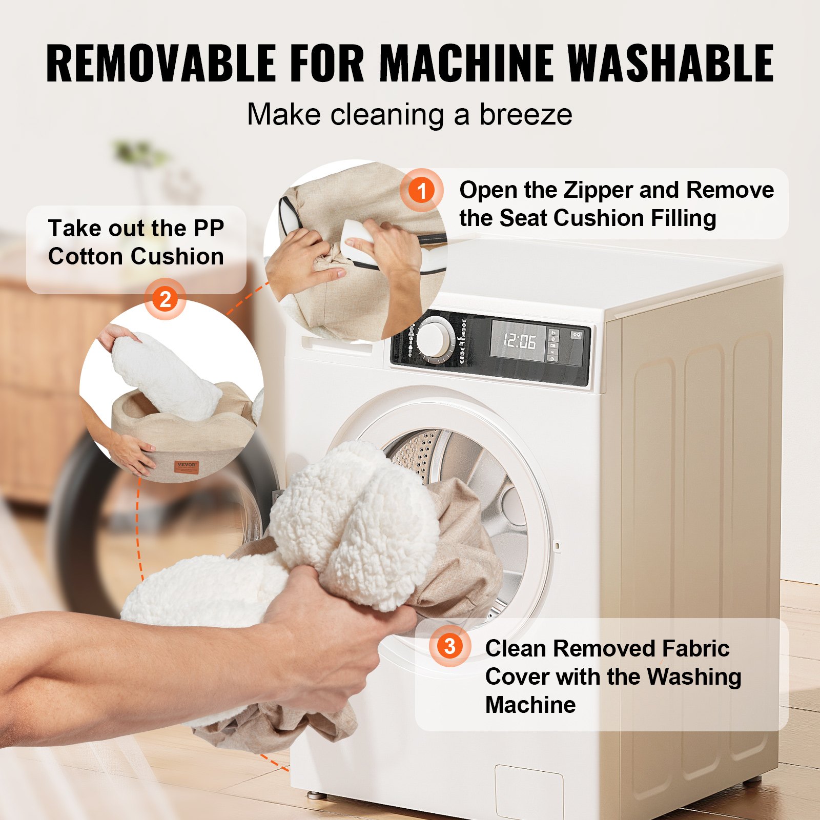 Cleaning is simple with a fully removable cover and built-in zipper. The cover and filling can be washed separately, making maintenance quick and easy.