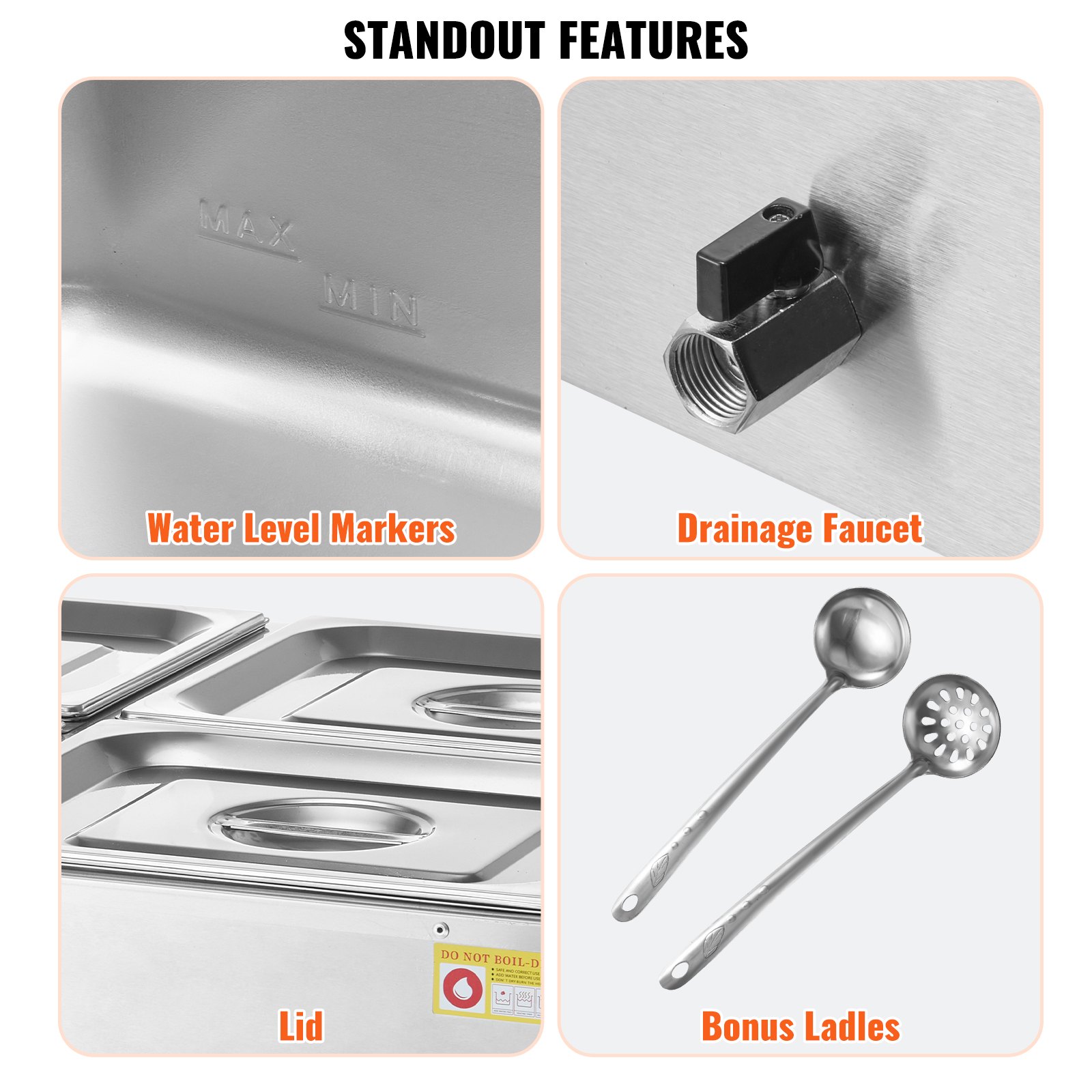 This commercial electric food warmer features a powerful heating system designed to quickly and evenly maintain the temperature of various dishes, ensuring they stay hot and flavorful. It is constructed with durable stainless steel for longevity and easy cleaning. The unit includes safety features such as a dry burning indicator and reset button, along with thoughtful design details like water level markers and a drainage faucet. It comes with multiple pans and lids, allowing for versatile food service in a professional setting.