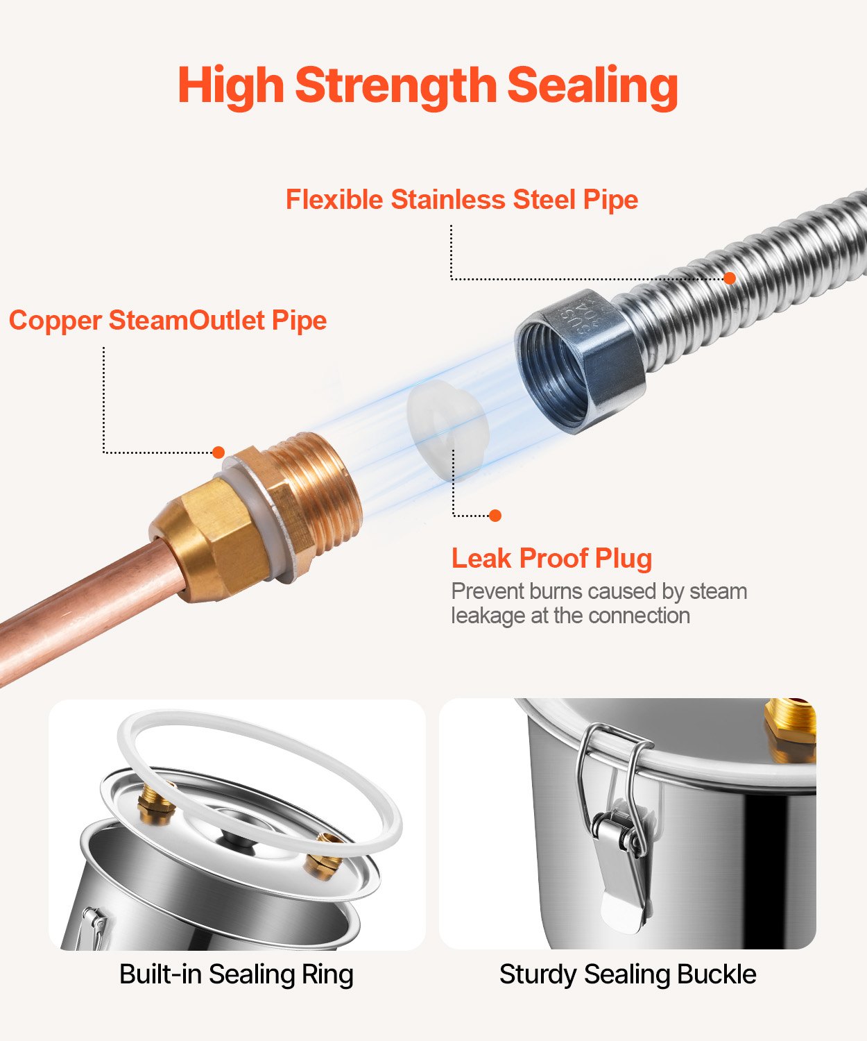 Sealing is ensured with silicone leak-proof plugs at pipe joints and fixed sealing latches on the fermentation lid, promoting hygiene and safety during operation. Tighten connections securely with a wrench to prevent leaks and ensure safe distillation.